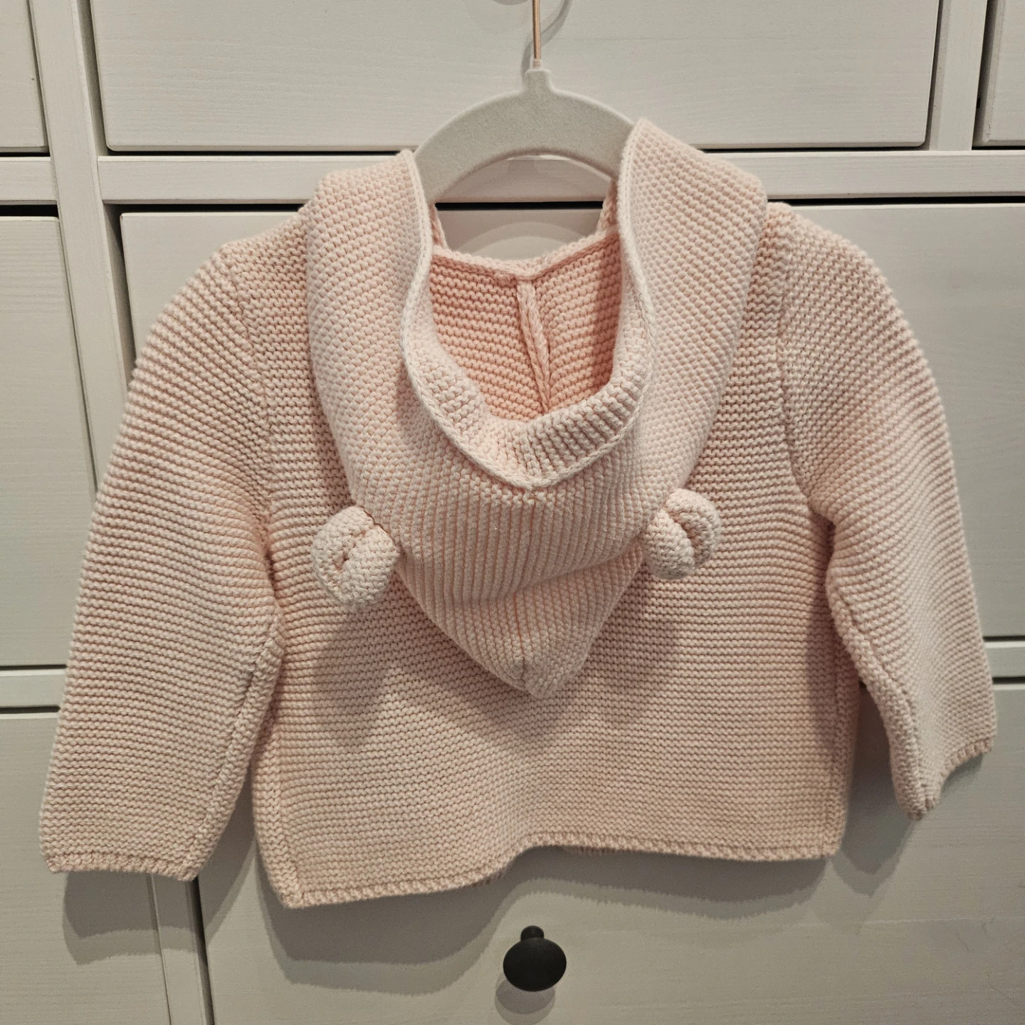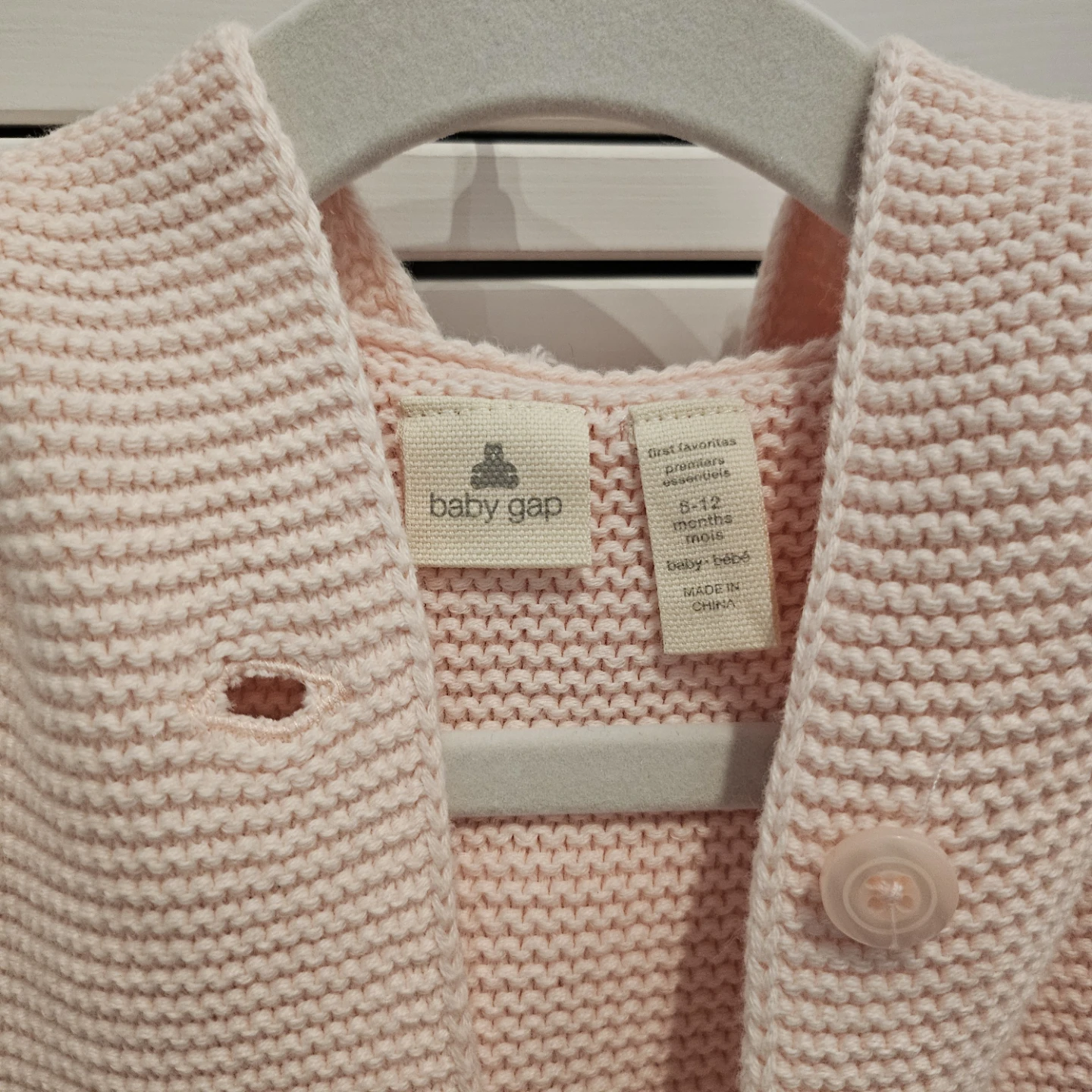 Sweet pink knit cardigan with a hood and matching hat from Baby Gap. Hat is a size 12-18 months, made with 100% cotton. Cardigan is 6-12 months size and features two front pockets and button closures. Both are in new condition.