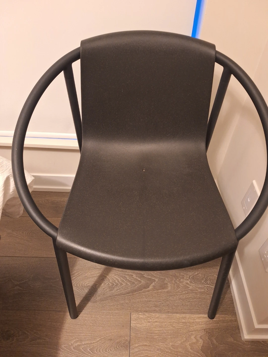 This is a black modern chair with a unique circular backrest design. It's made of sturdy plastic with a metal frame for stability. Its sleek, minimalist look makes it a great addition to any contemporary space. From Umbra.
