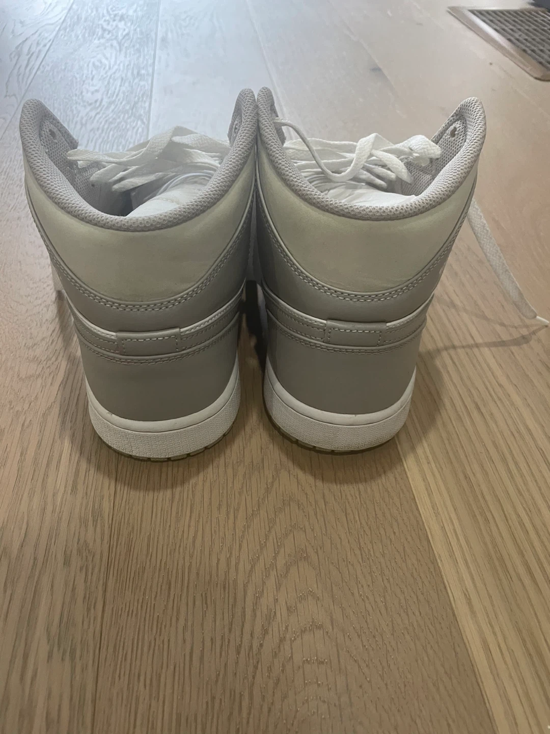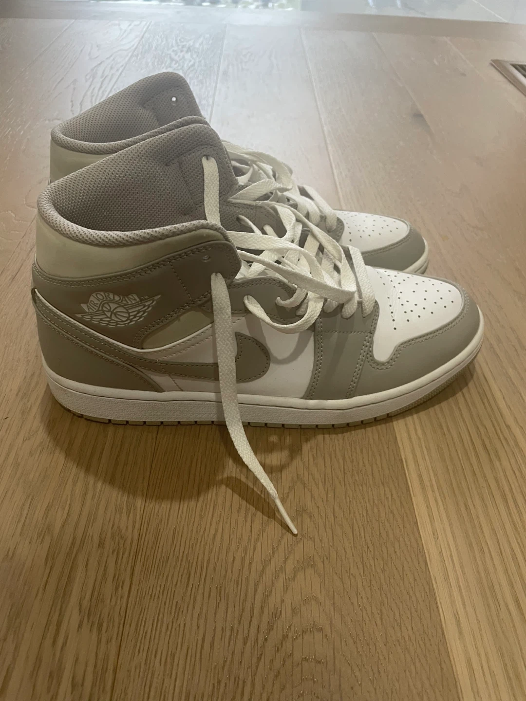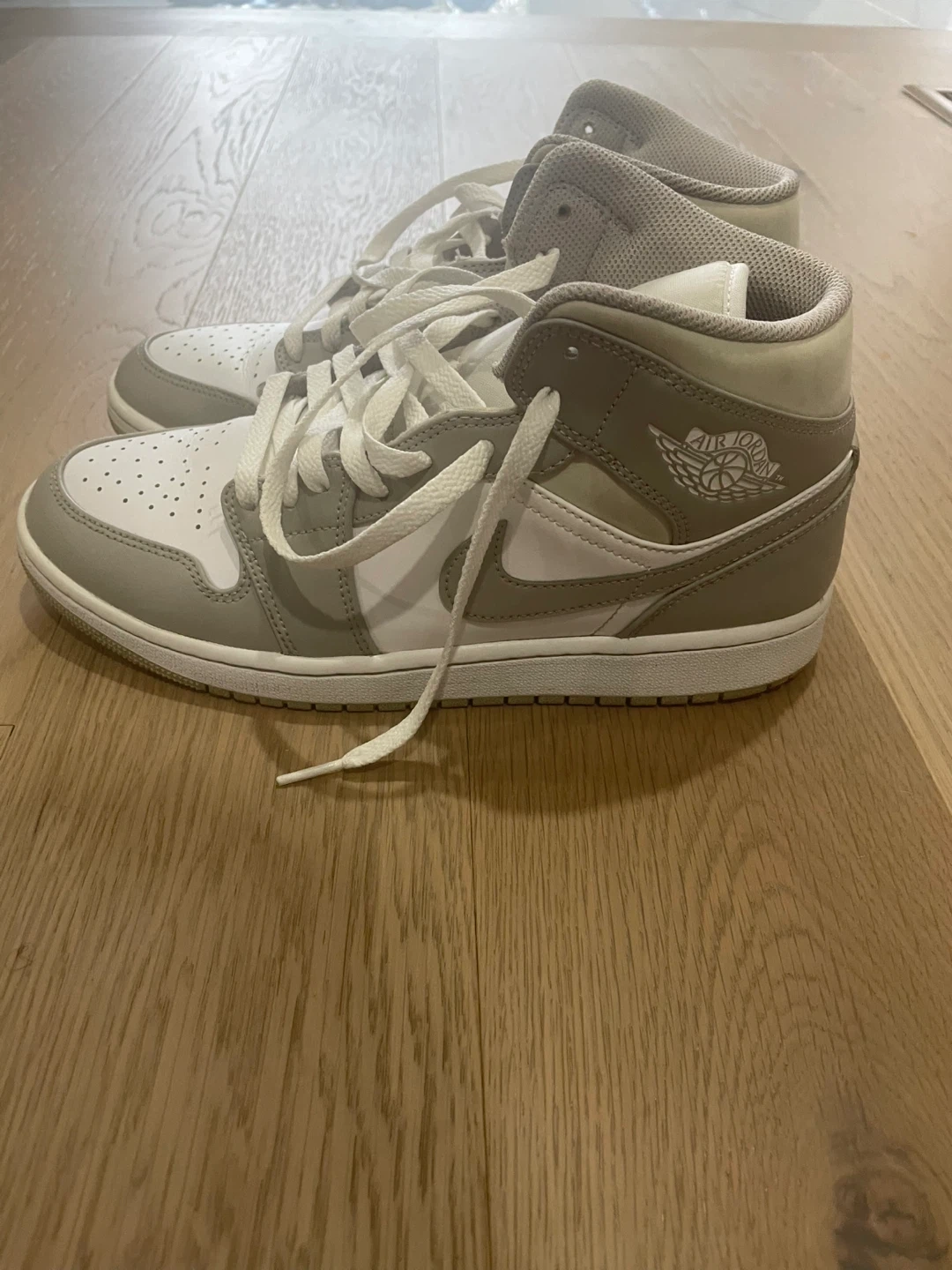 These are Air Jordan 1 Mid SE sneakers in a grey fog colourway. They feature a classic mid-top silhouette with a leather and synthetic upper. This pair is great for casual wear and everyday styling.
