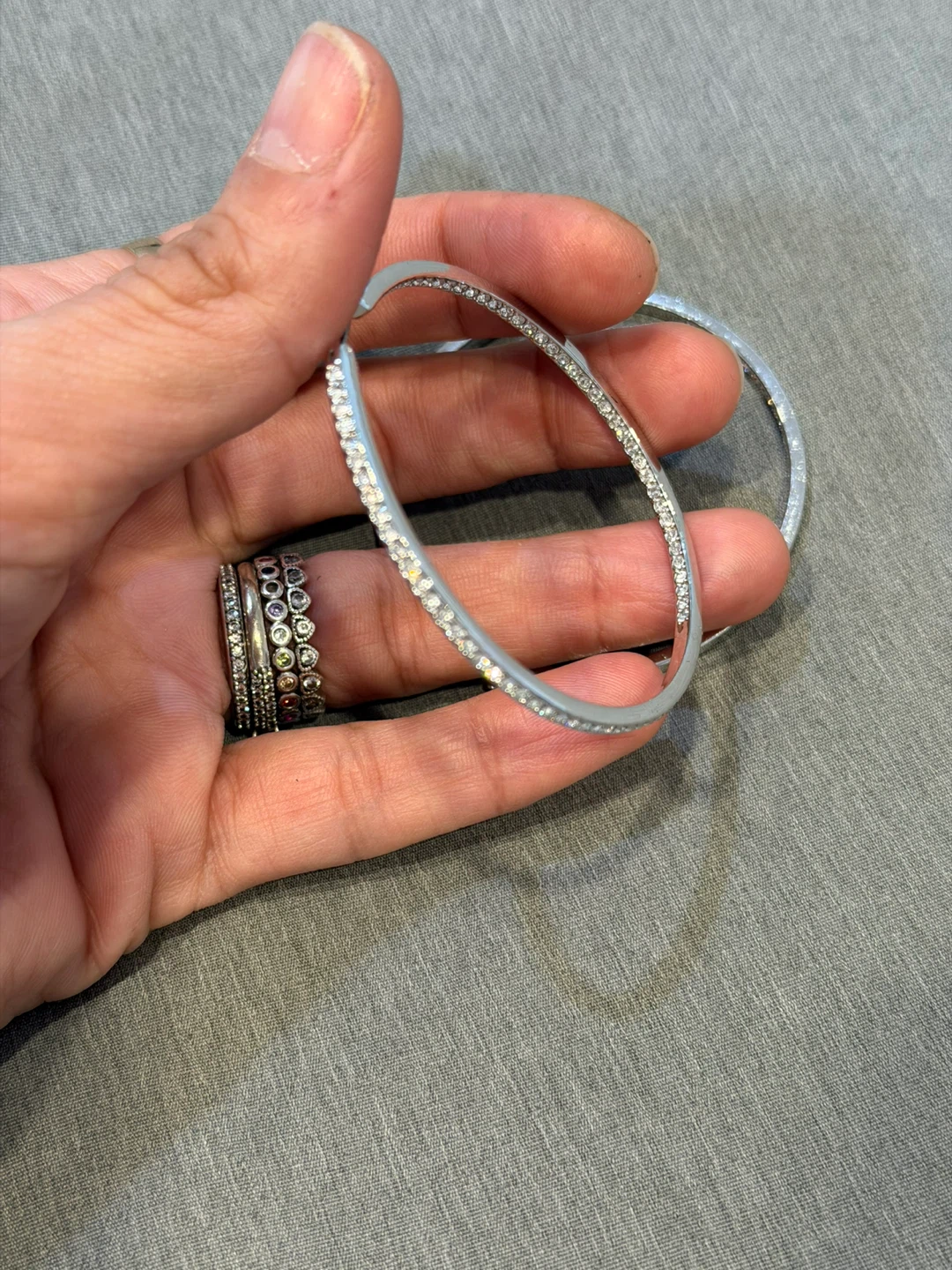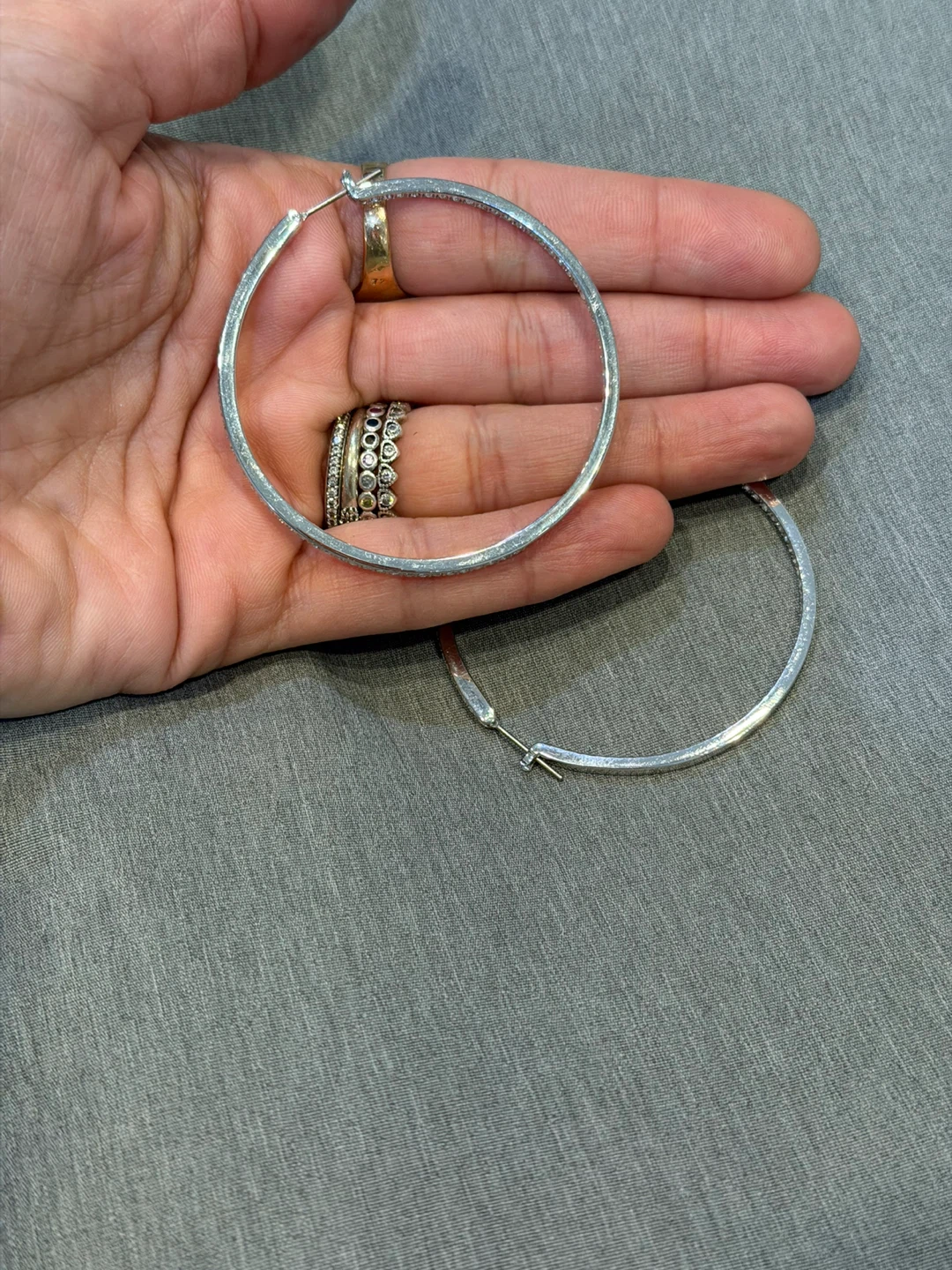 Sparkly silver-toned hoop earrings with clear rhinestones. These are large hoops, perfect for adding a bit of glam to any outfit. They're lightweight and comfortable for all-day wear!