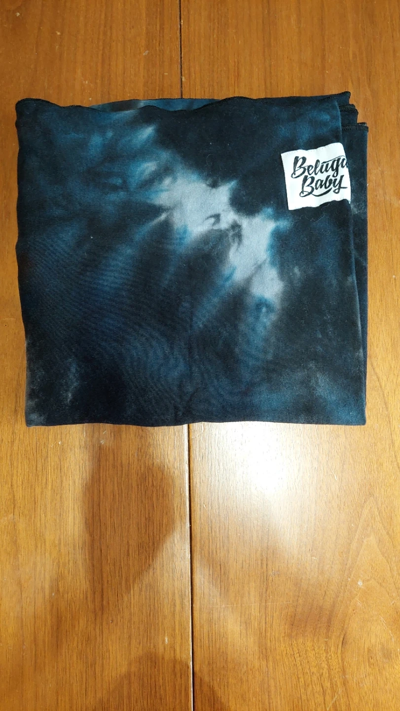 Beluga Baby Saga Wrap in Ocean Blue with a tie-dye pattern. Made with a stretchy, breathable fabric for comfortable babywearing. It's perfect for keeping your little one close and secure!