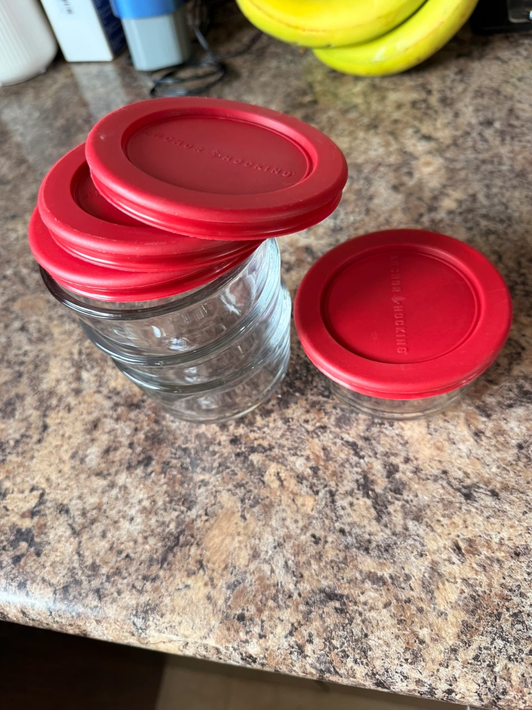 Set of 4 clear glass storage containers. They come with bright red, tight-fitting lids. These are handy for storing leftovers or dry goods in the pantry.