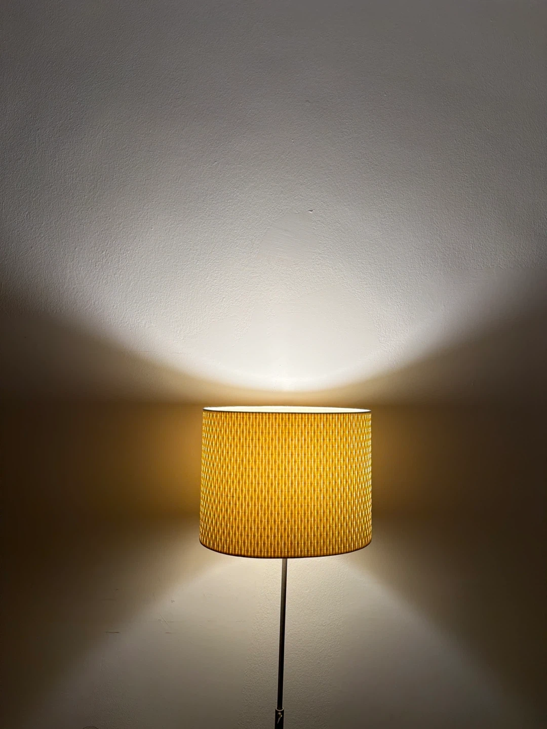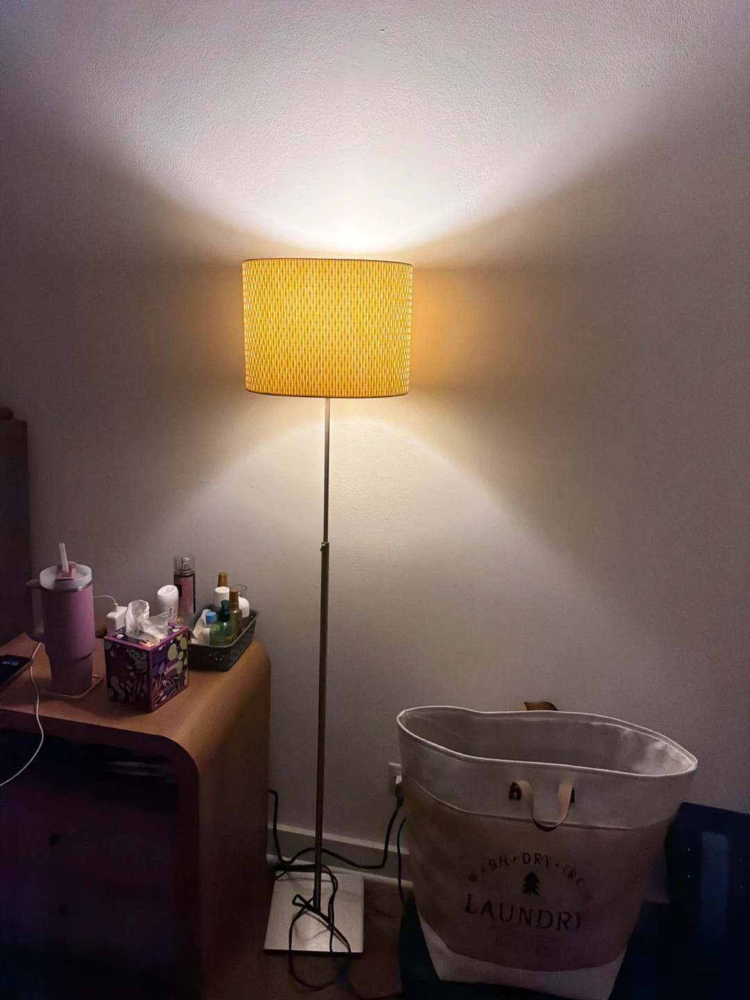 Here's a floor lamp with a woven shade that gives off a warm, inviting glow. It's perfect for adding some cozy ambiance to any room. The lamp is in great condition and ready to brighten up your space