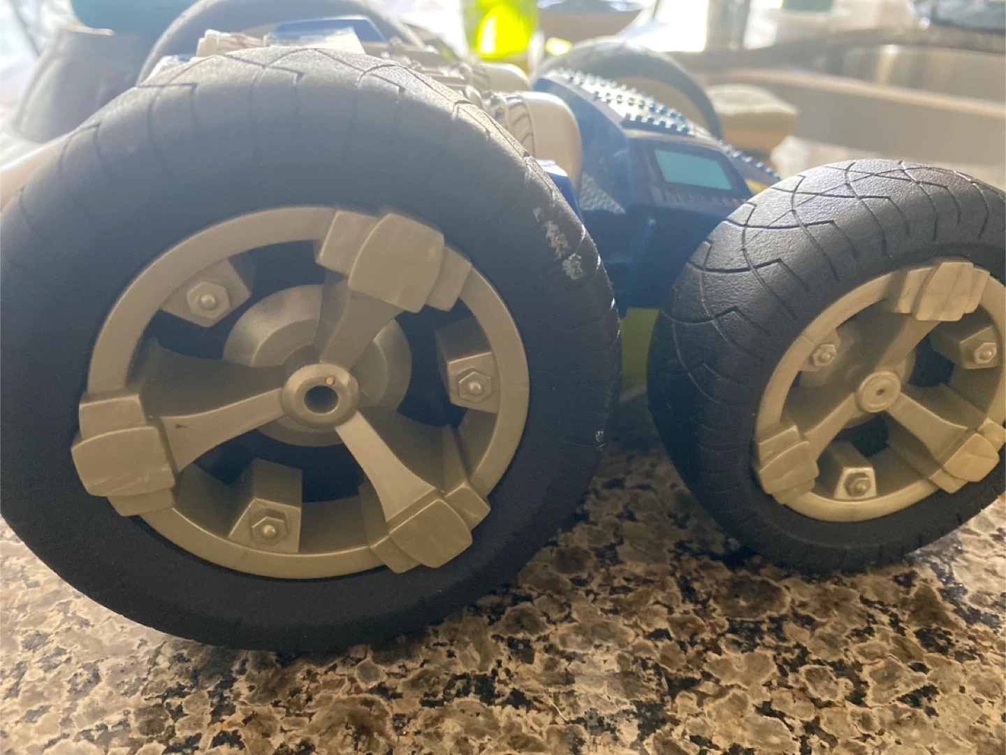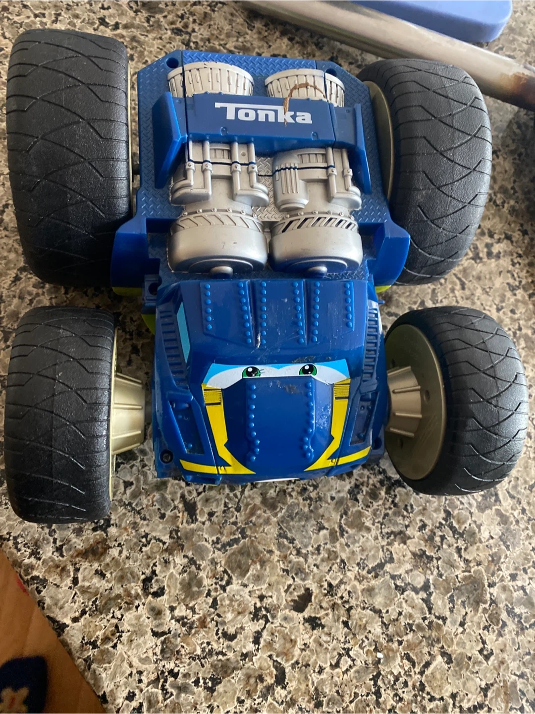 This is a durable blue and yellow Tonka monster truck toy. It is also is reversible. Green on the other side. It features large, rugged tires and a playful design. Great for imaginative play!