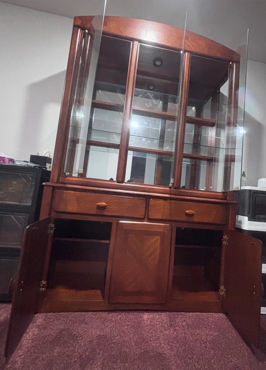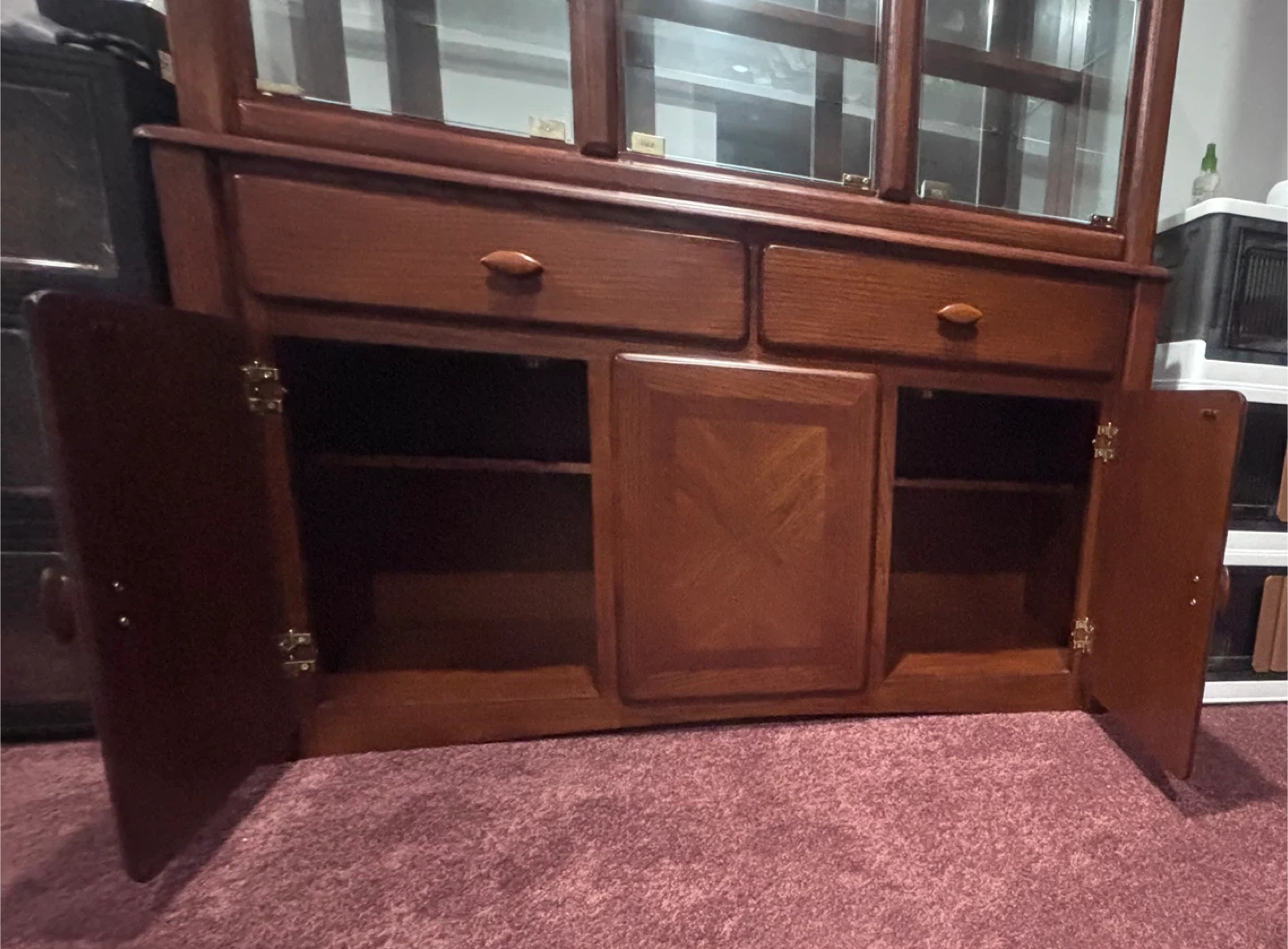 This curio cabinet features a rich wood finish and glass doors for displaying items. It has multiple shelves and drawers for storage. It's perfect for showcasing collectibles or dishes!