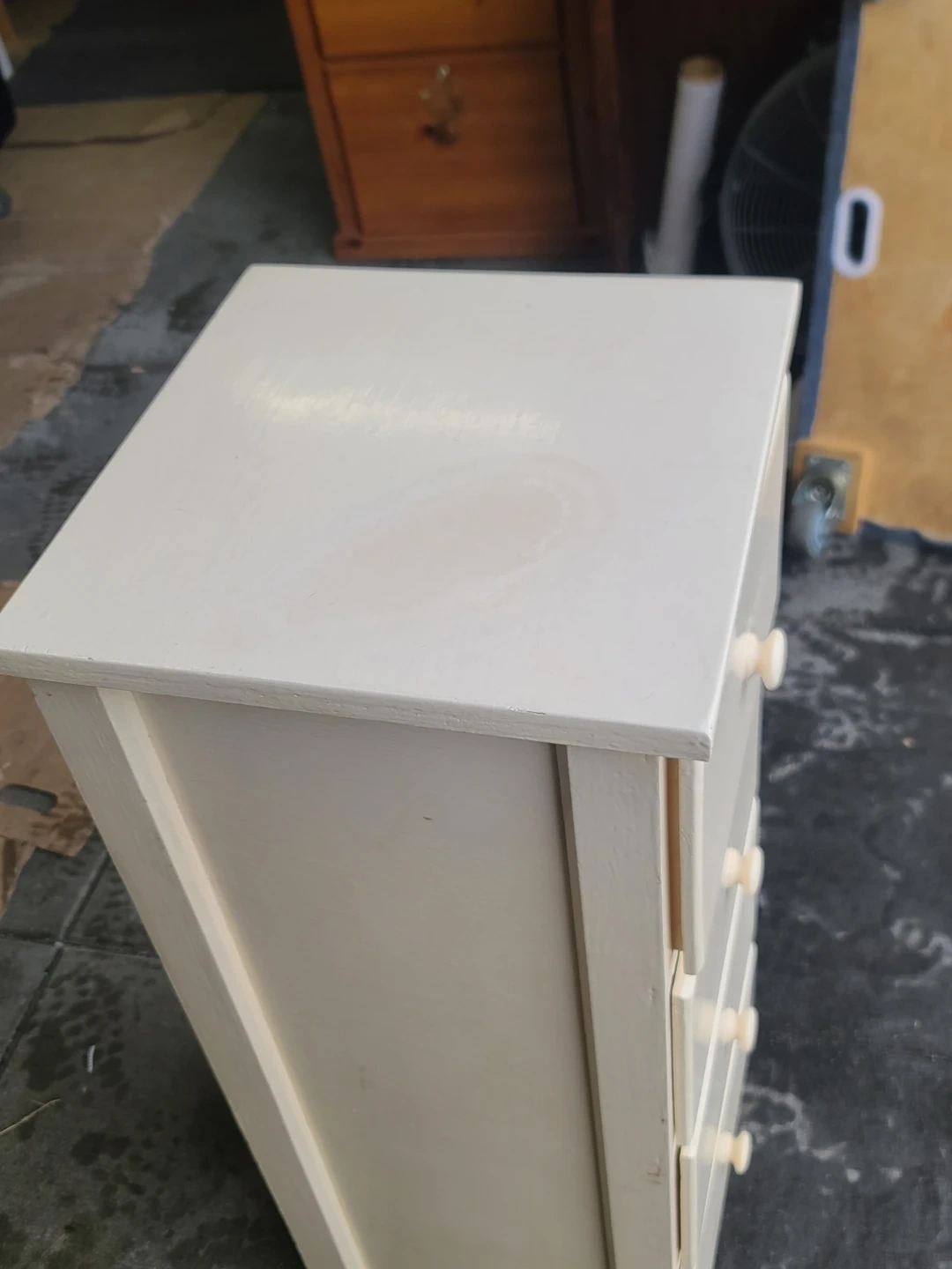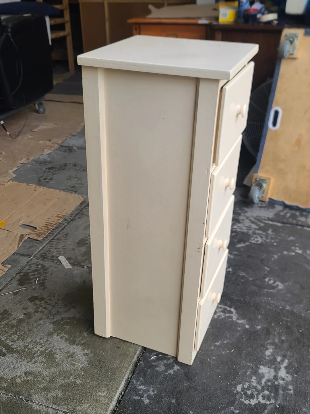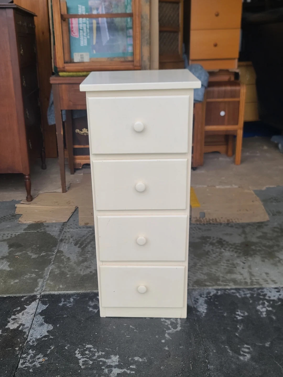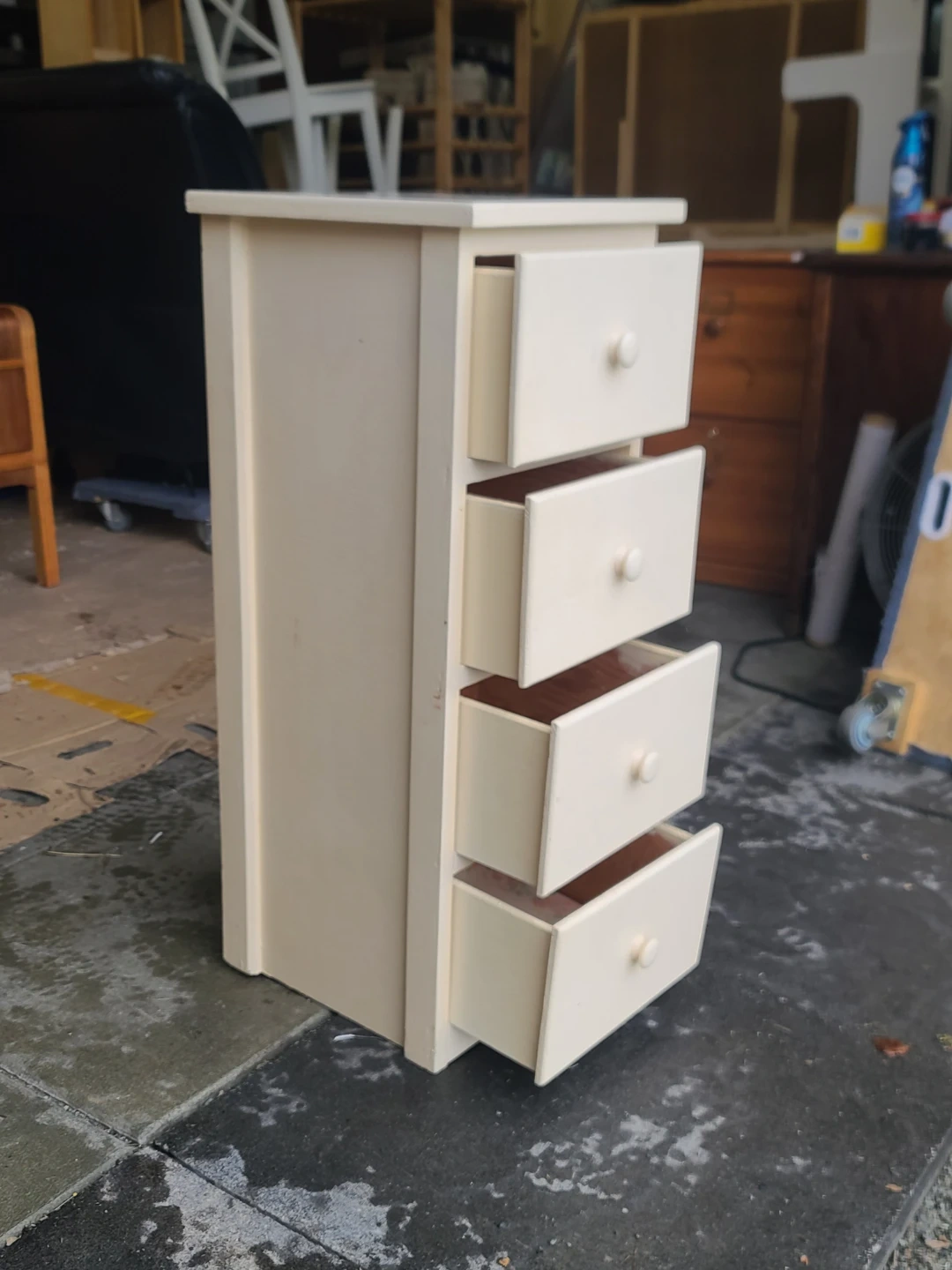 Compact 4-drawer dresser. Cream color with round knobs. All drawers slide smoothly. Good for extra storage or a small space. Measurements: W 14" X D 14" X 35". Delivery can be arranged. Viewing and pickup by appointment.