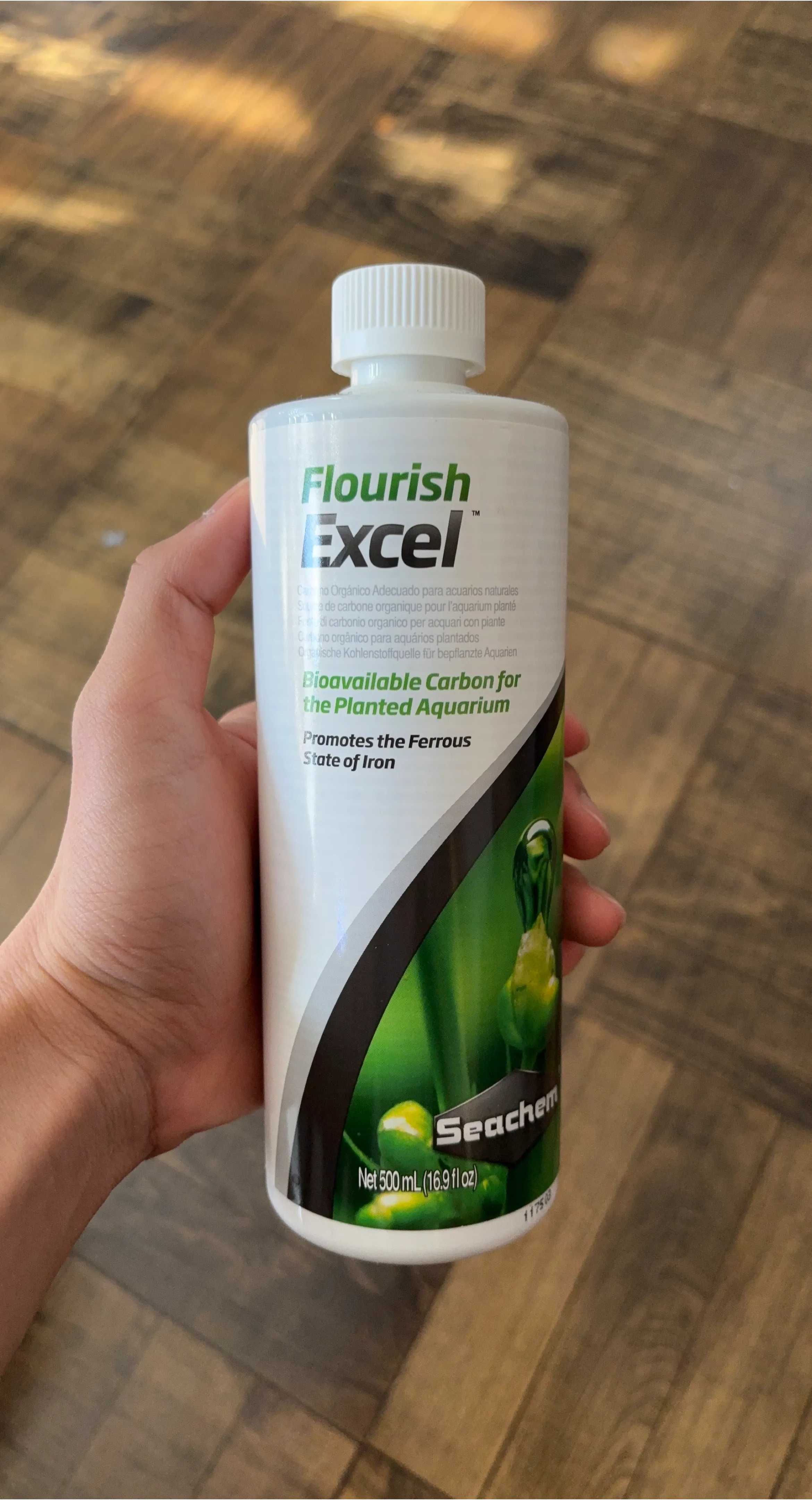 This is Seachem Flourish Excel, a bioavailable carbon supplement for planted aquariums. Barely used, I don’t need it anymore as I decided to go with co2 gas. It promotes the ferrous state of iron. Net contents are 500 mL (16.9 fl oz).