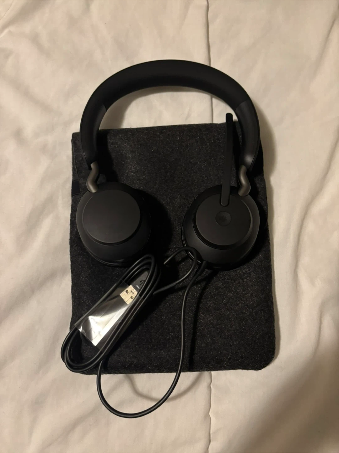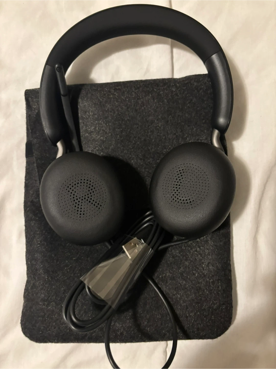 Black Jabra Evolve2 40 headset with a USB-A connection. It features 3-microphone call technology and a noise-isolating design. Includes a carrying pouch and charging cable.
