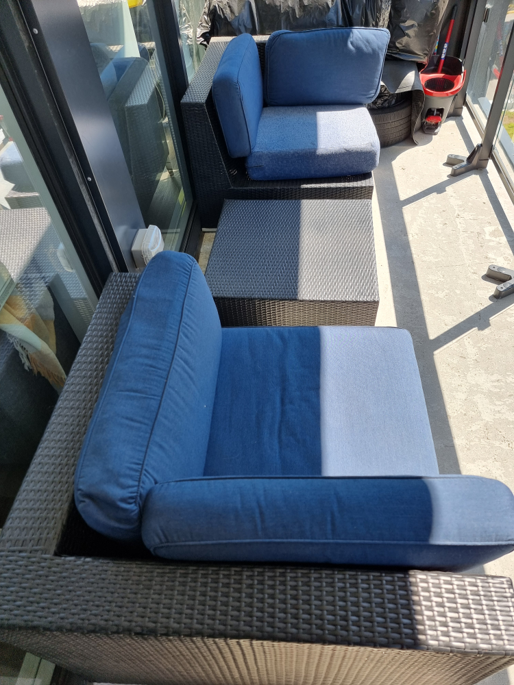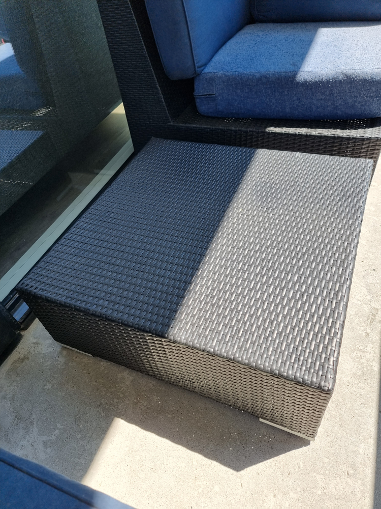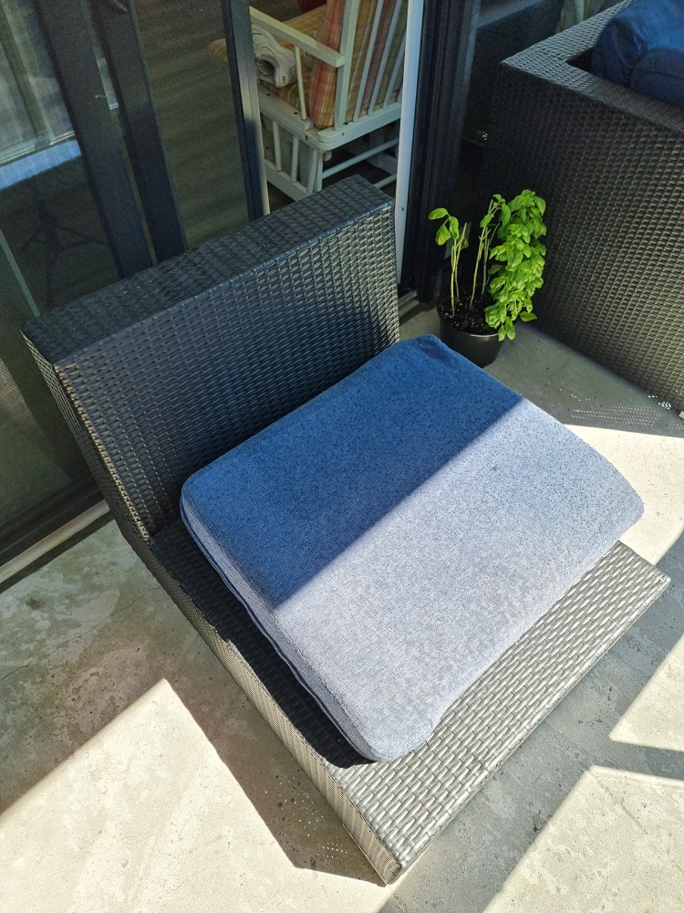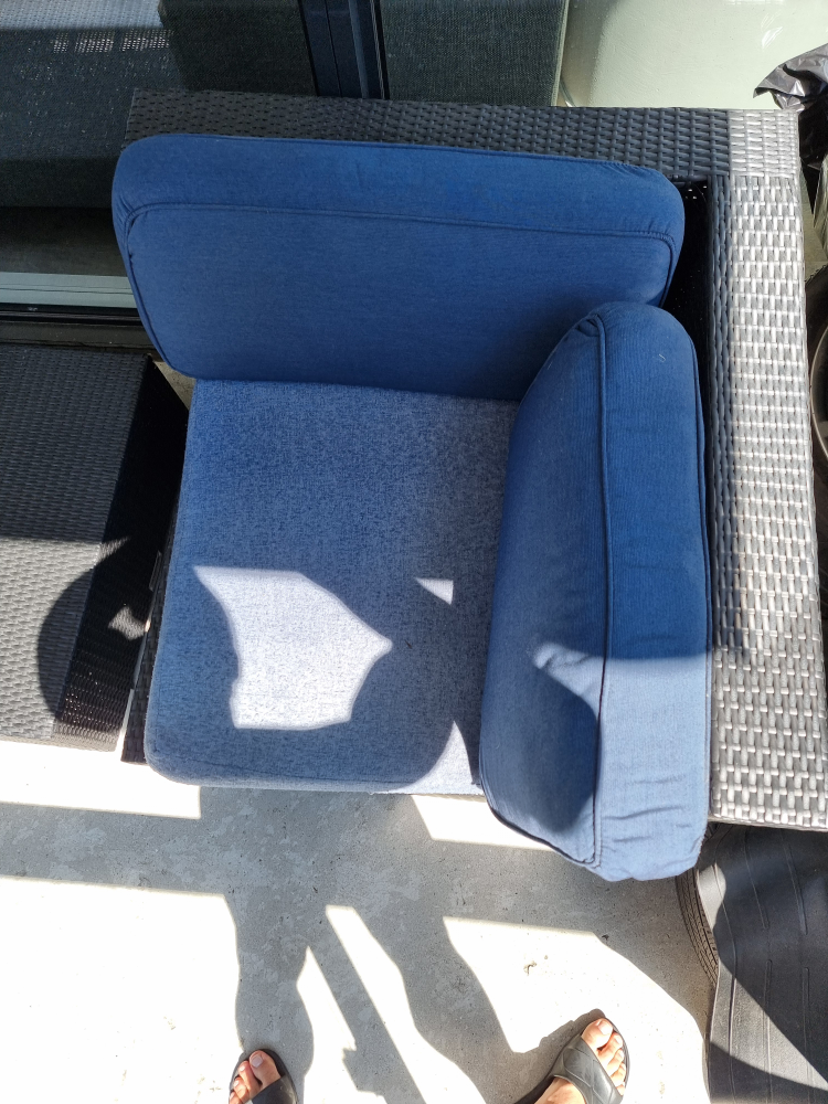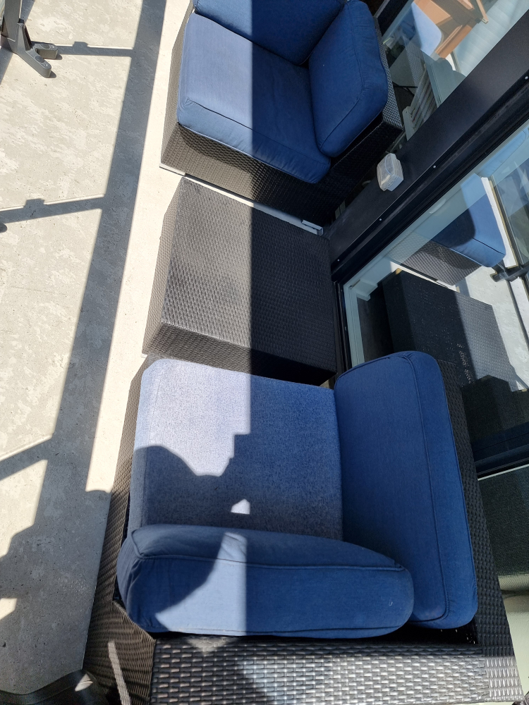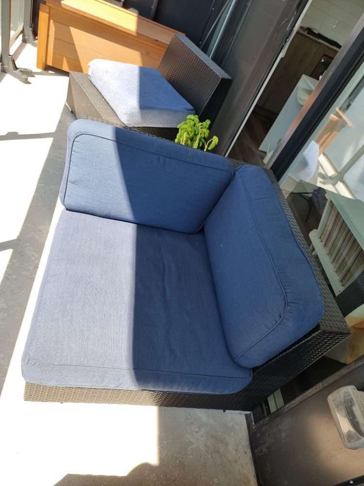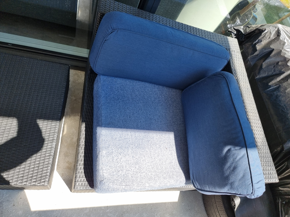 Selling a comfy blue wicker outdoor patio chair and table set! The chair has a nice, deep blue cushion, and the table is a dark grey wicker. Perfect for enjoying those summer evenings on the deck or patio.