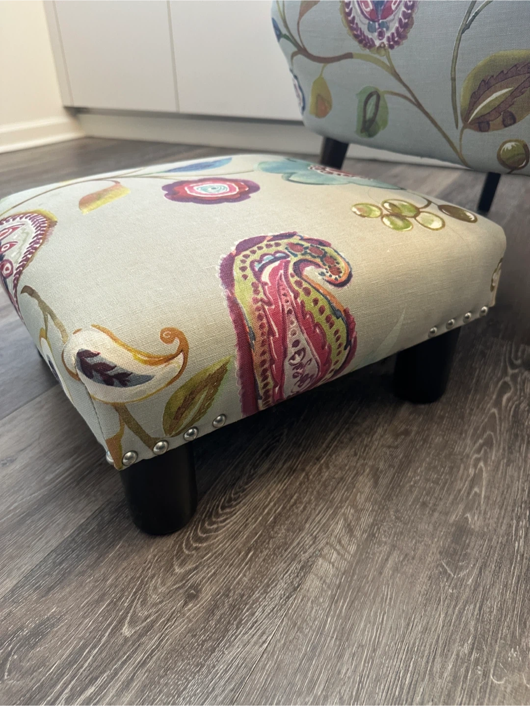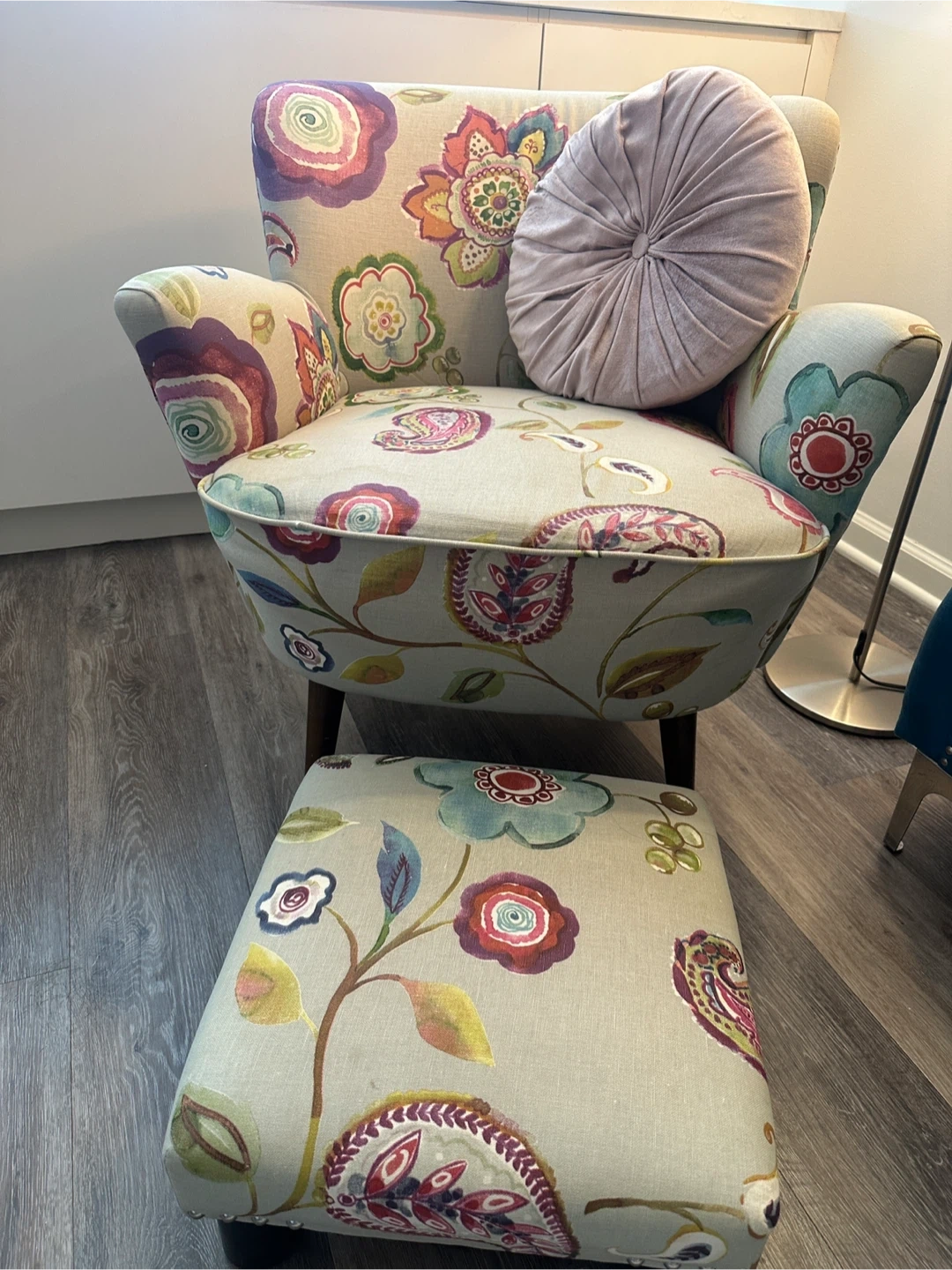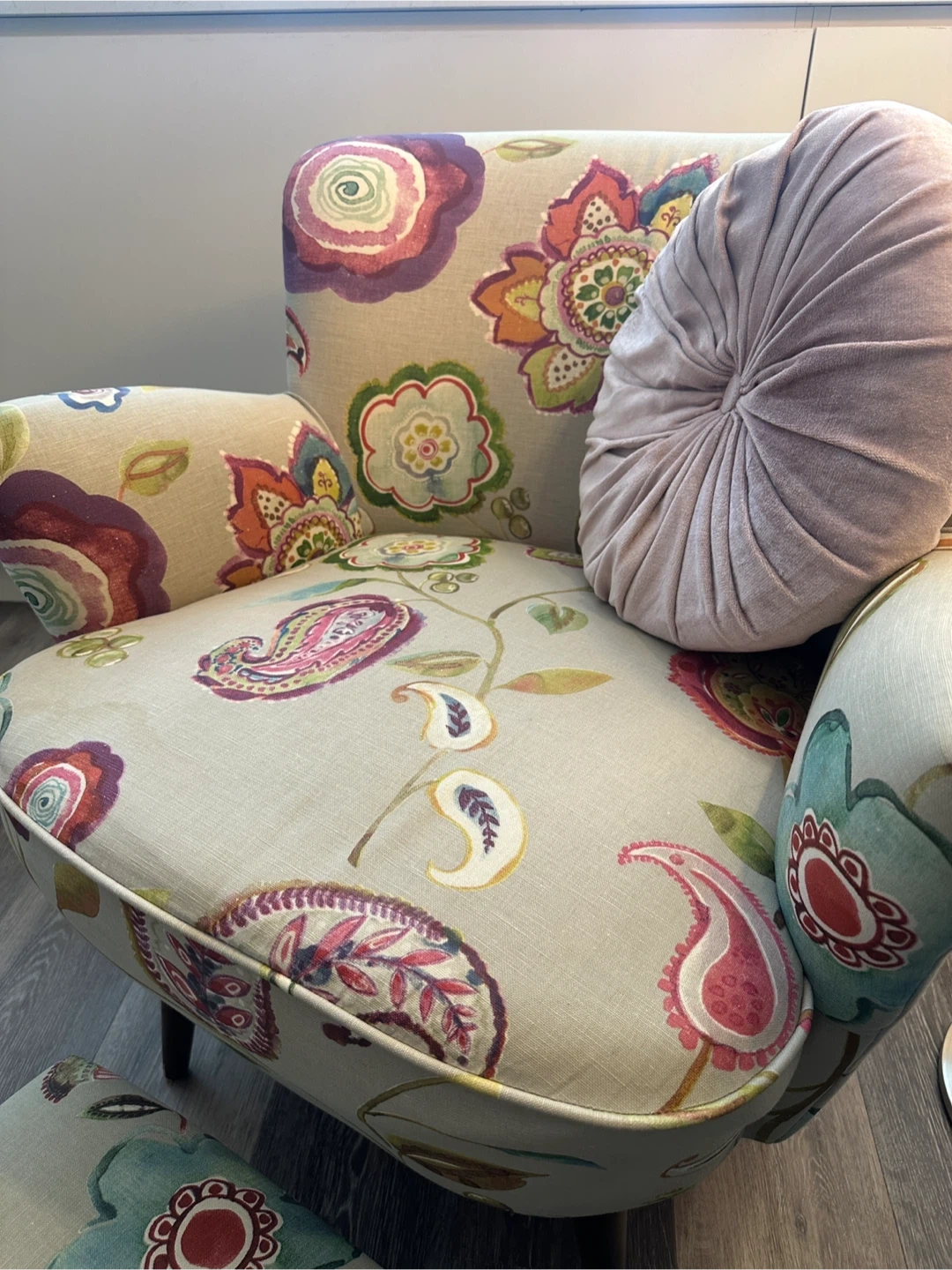 This upholstered accent chair comes with a matching ottoman and decorative pillow. It features a vibrant floral paisley pattern on a light neutral background. The chair and ottoman have wooden legs for support and has been professionally cleaned