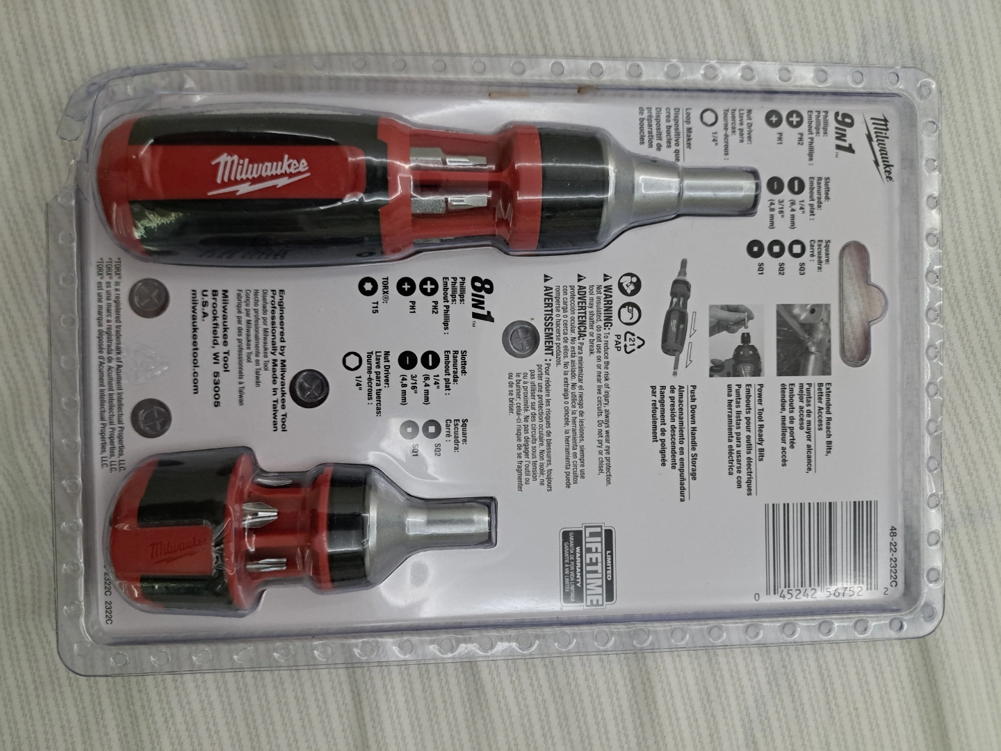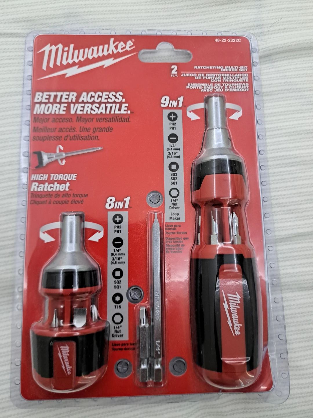 New in package. 8-in-1 ratcheting screwdriver with multiple bits. High torque. Better access, more versatile. Includes various sizes and types of bits.
