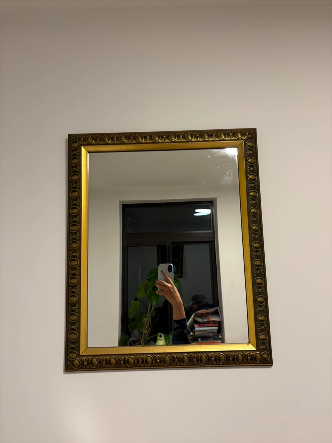This is a decorative wall mirror with an ornate gold-colored frame. It has a classic design and can add a touch of elegance to any room. It's ready to hang and would be a nice addition to a hallway or living space.