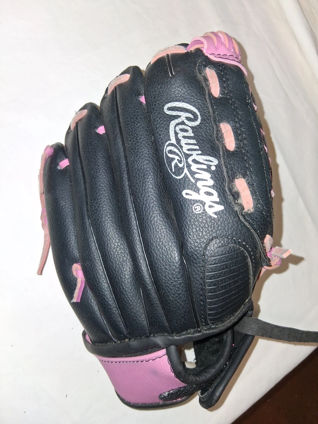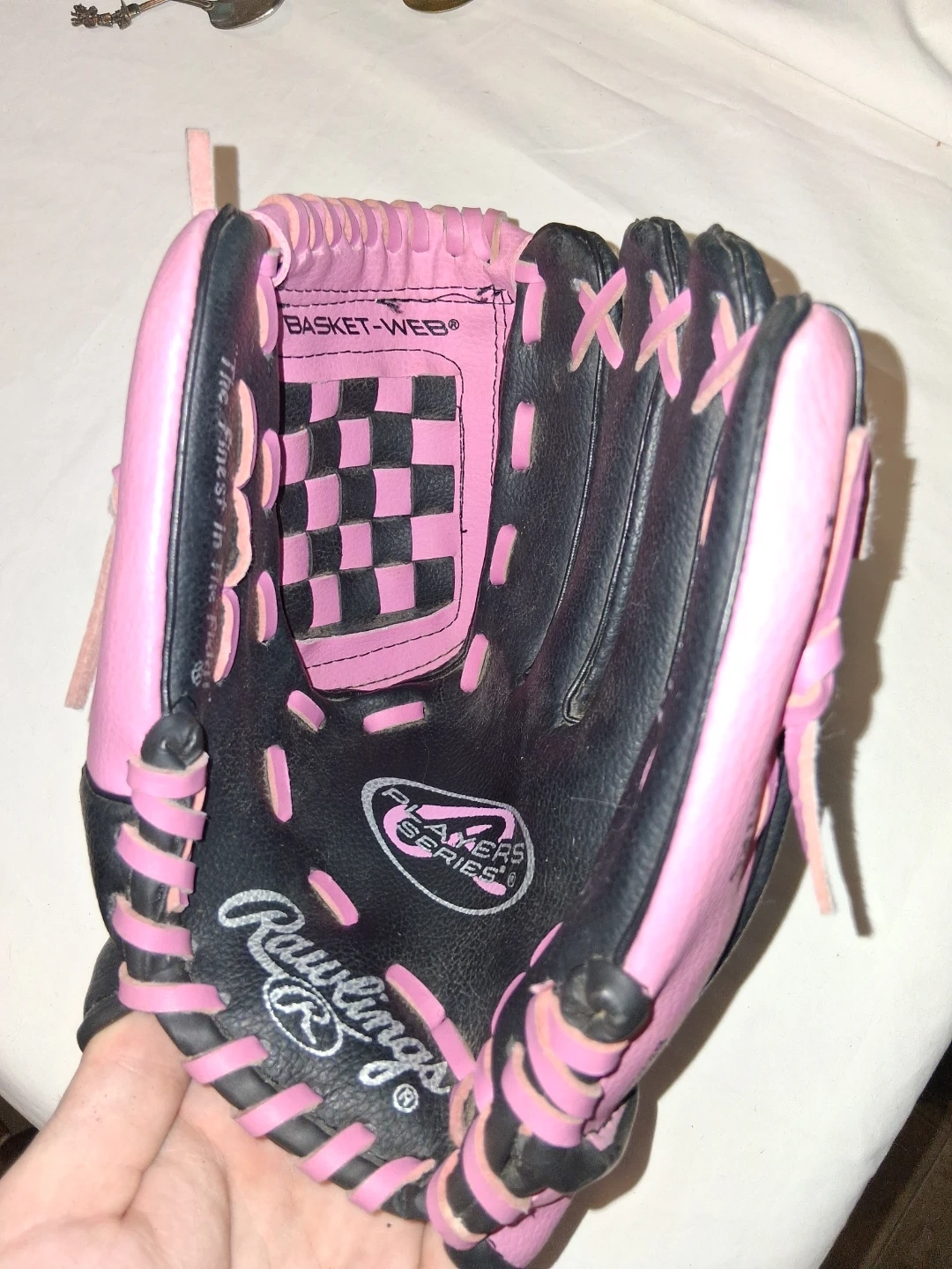 This is a Rawlings youth baseball glove. It's black and pink with a basket-web design. Glove size is suitable for young players.