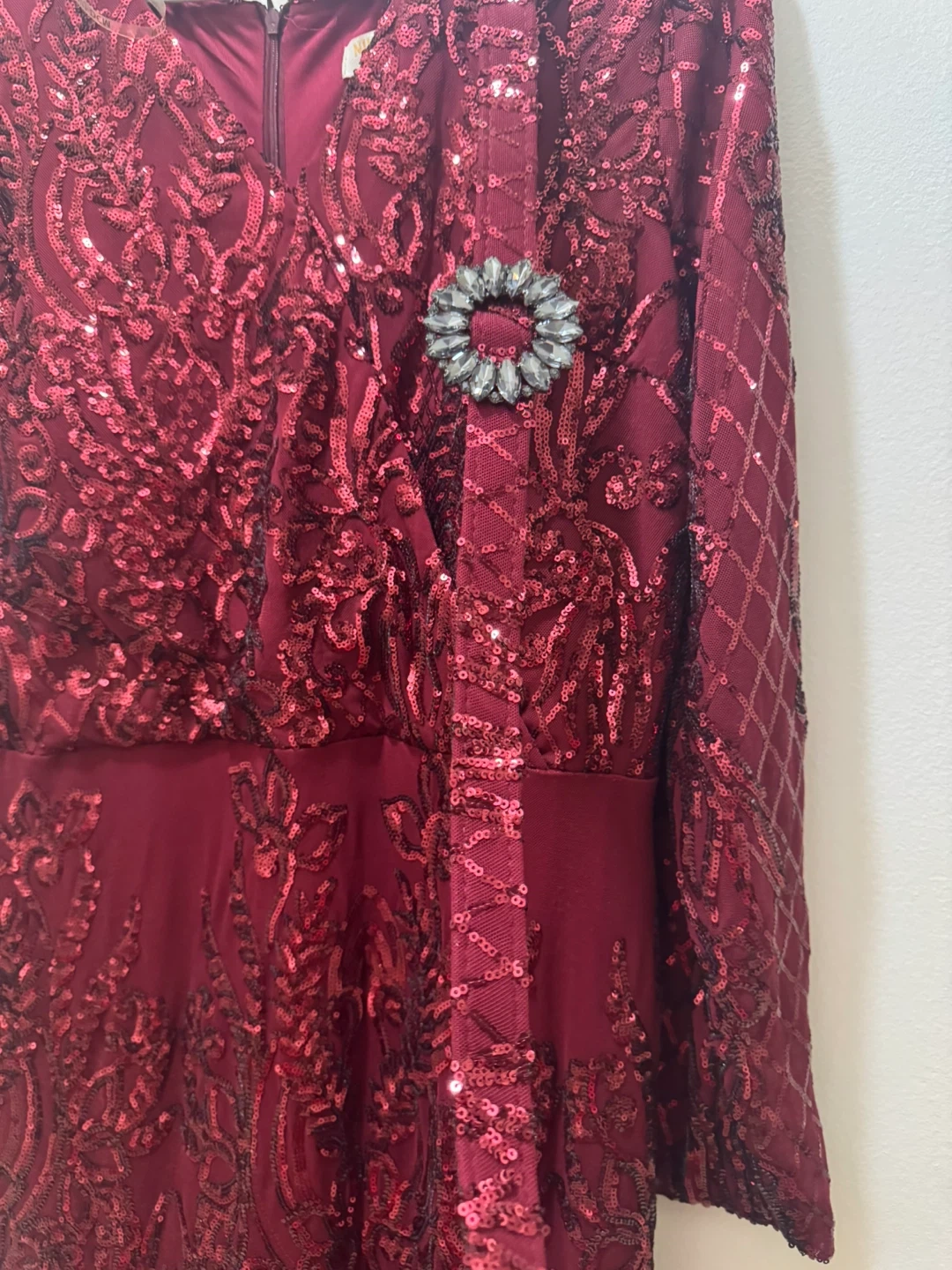 Here's a beautiful burgundy dress covered in sequins! It has long sleeves and a decorative brooch. Perfect for a special occasion!