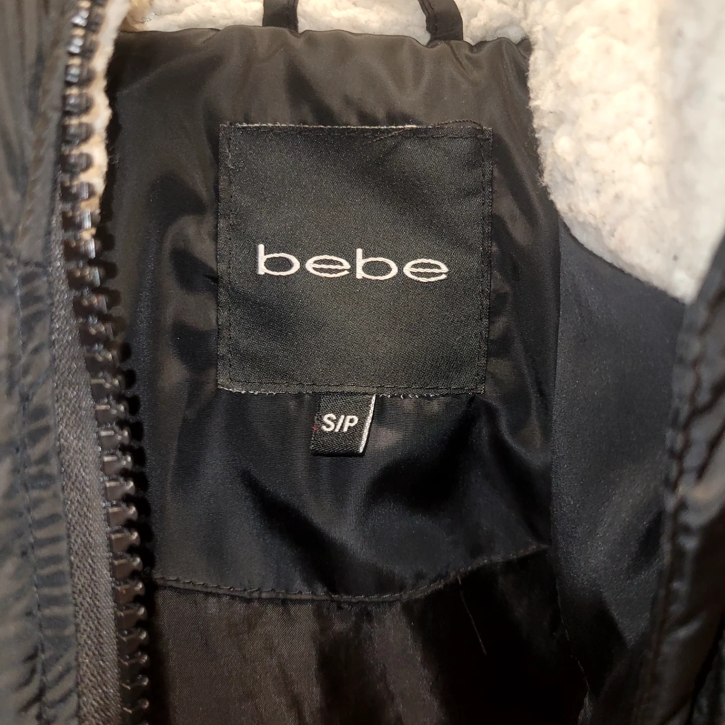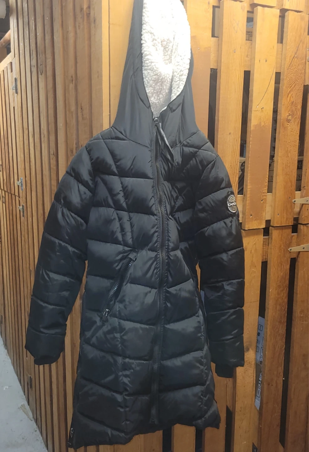 This black puffer coat is from Bebe and is a size S/P. It features a quilted design and a sherpa-lined hood. It's perfect for keeping warm on chilly days!