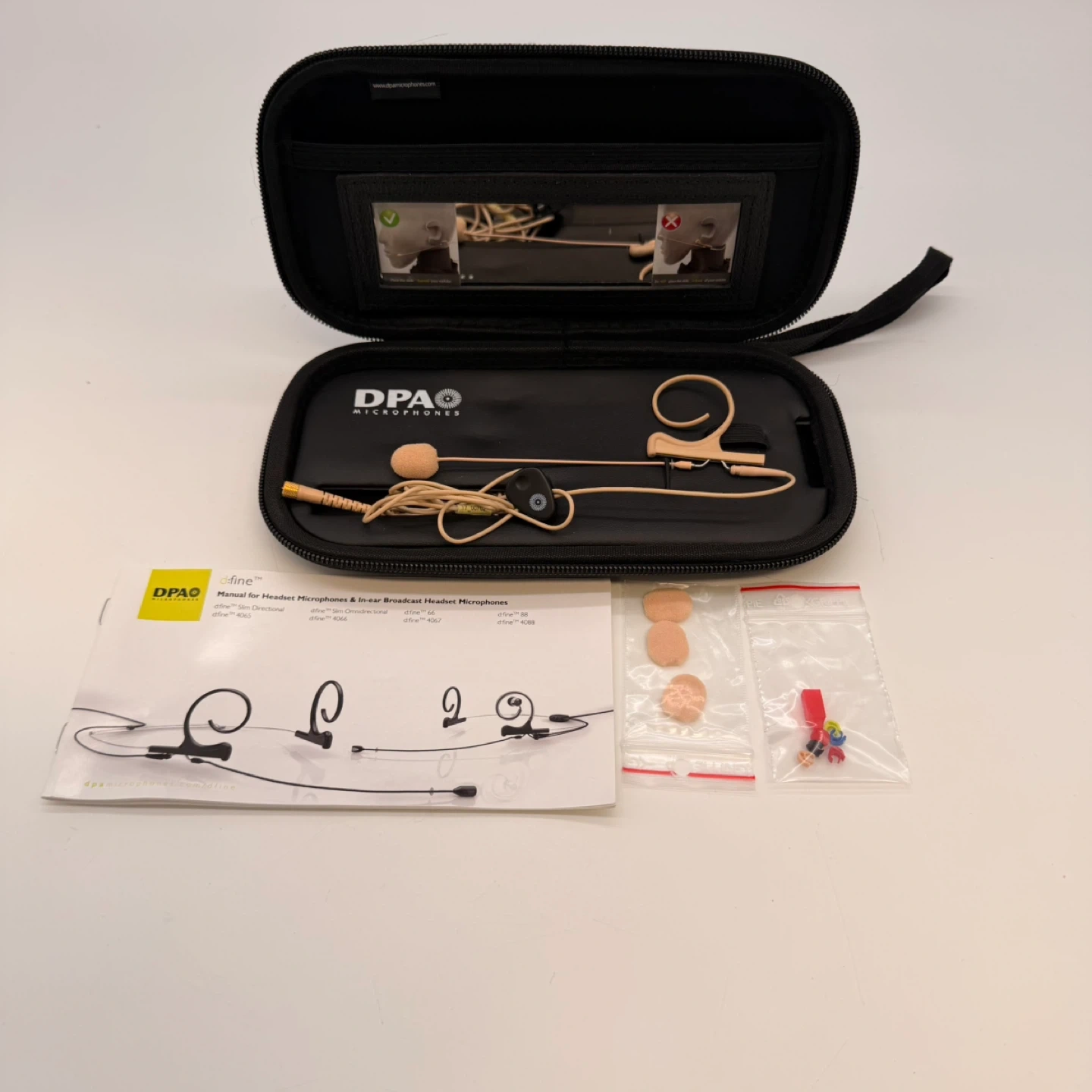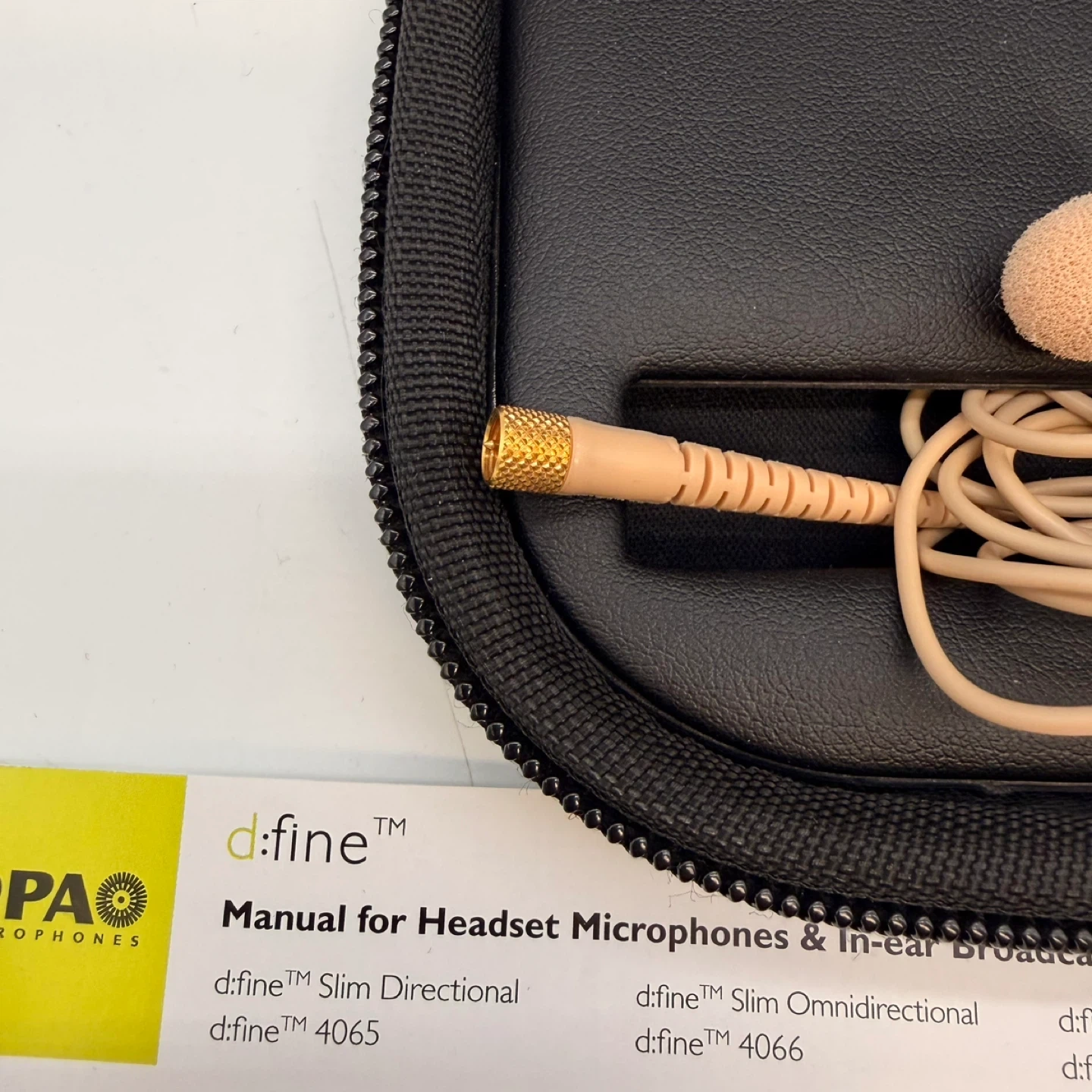 Original DPA d:fine® Slim single-ear directional headset microphone, model FIDF00-M, in beige.