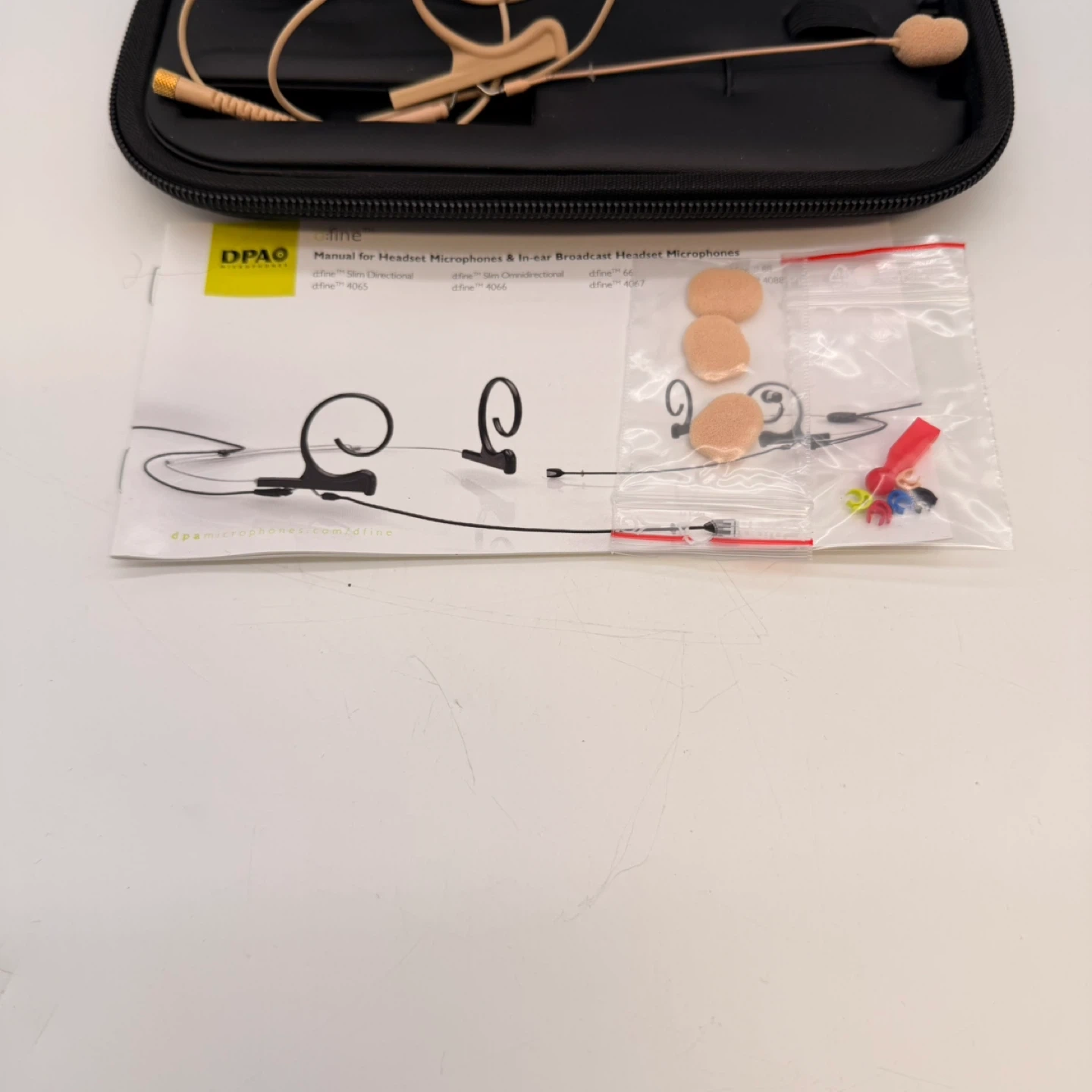 Original DPA d:fine® Slim single-ear directional headset microphone, model FIDF00-M, in beige.