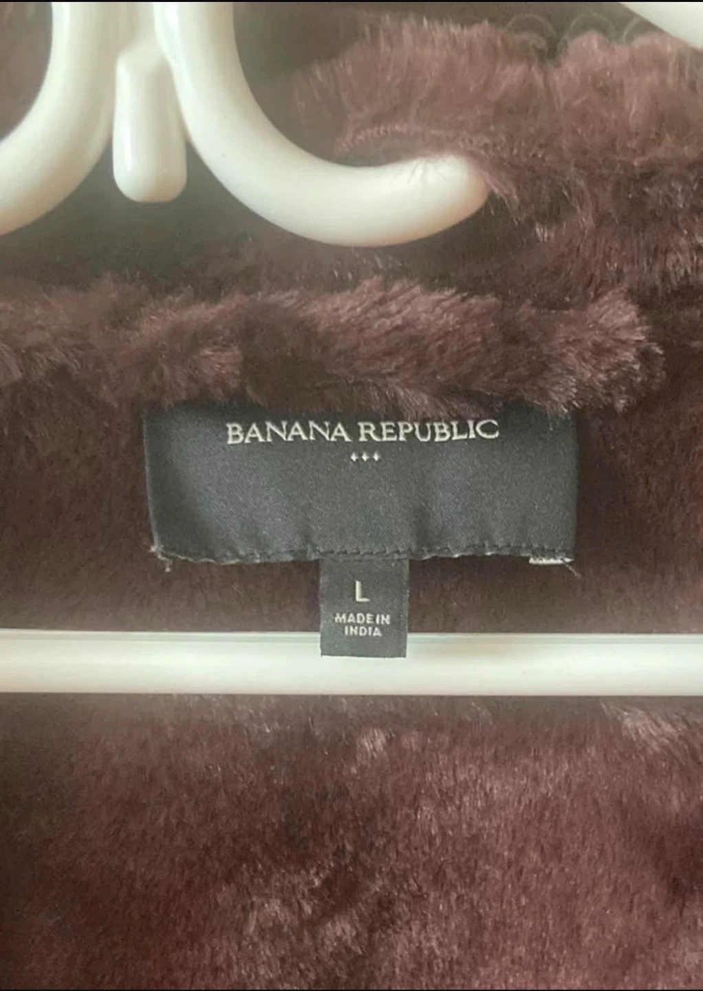 This Banana Republic jacket features a faux suede exterior with a plush faux fur lining and collar. It has a button closure and side pockets. Made in India. Size L.