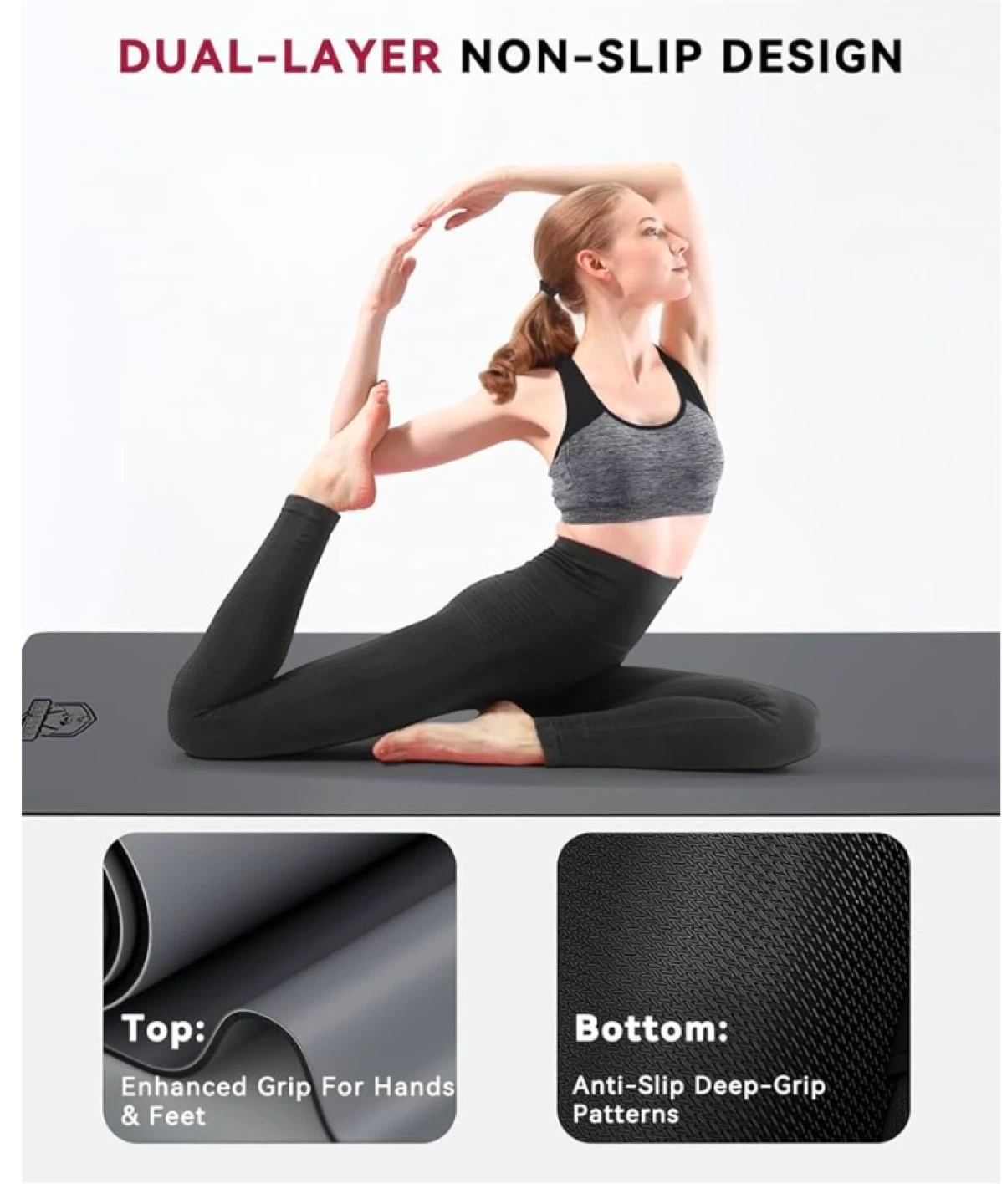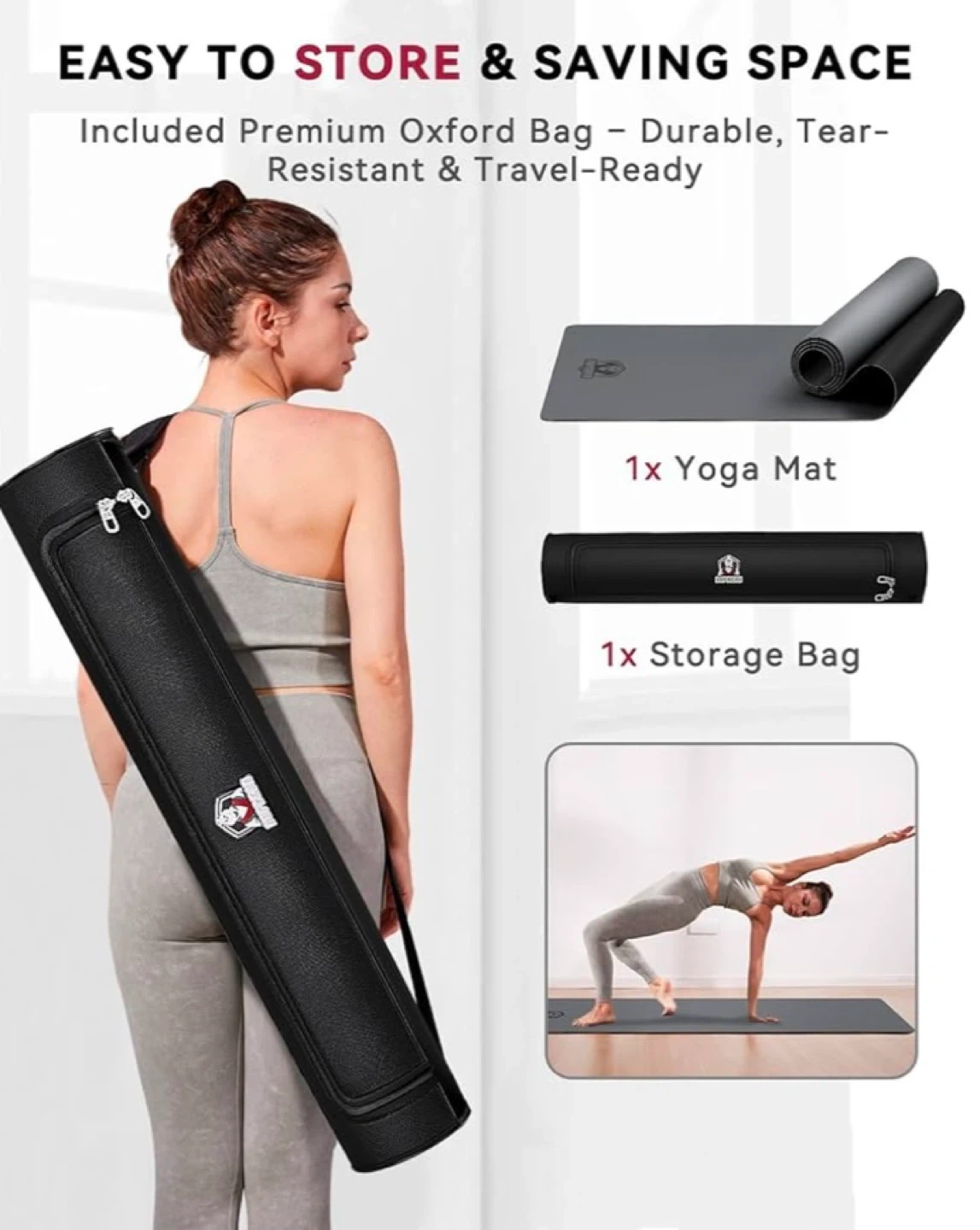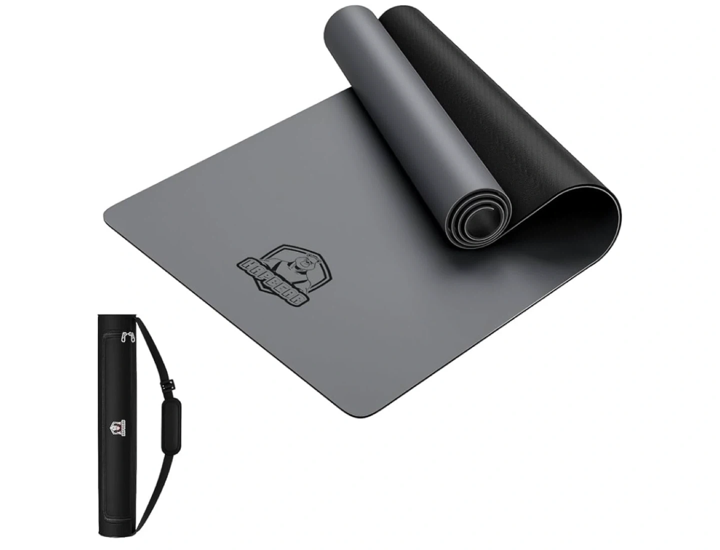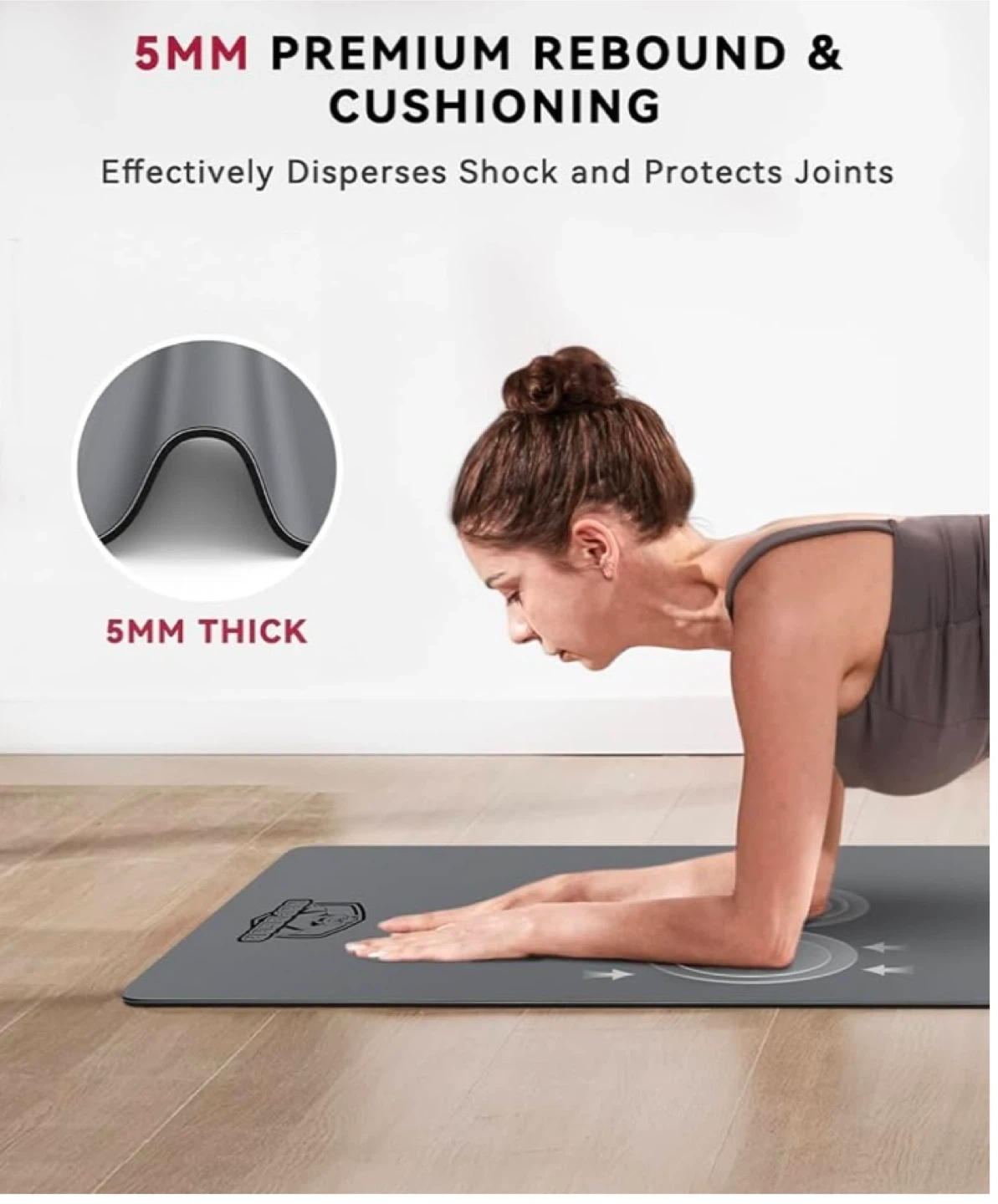 This professional grade yoga mat is perfect for your home workouts! It's 72 inches by 30 inches, providing ample space for extended movement. The 5mm premium rebound and cushioning effectively disperses shock and protects your joints. It also features a dual-layer non-slip design for enhanced grip for hands and feet, and anti-slip deep-grip patterns on the bottom. Comes with a carry bag!