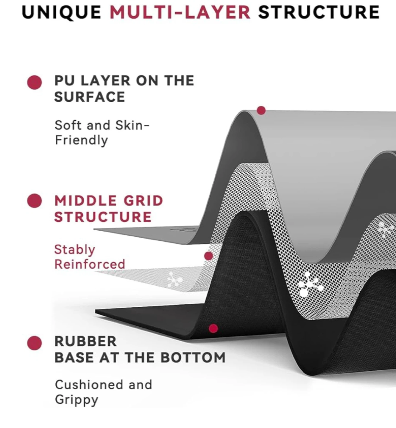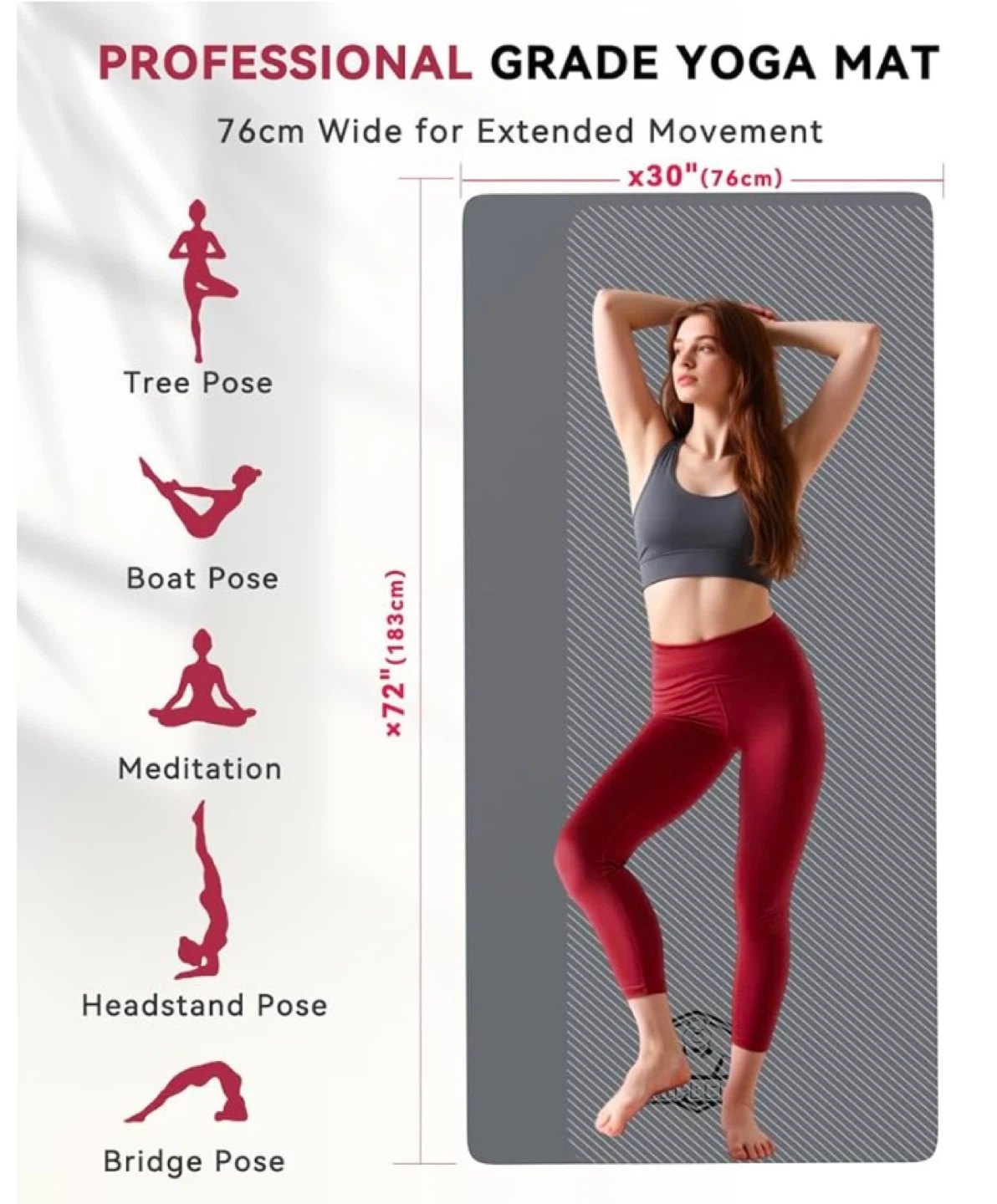 This professional grade yoga mat is perfect for your home workouts! It's 72 inches by 30 inches, providing ample space for extended movement. The 5mm premium rebound and cushioning effectively disperses shock and protects your joints. It also features a dual-layer non-slip design for enhanced grip for hands and feet, and anti-slip deep-grip patterns on the bottom. Comes with a carry bag!