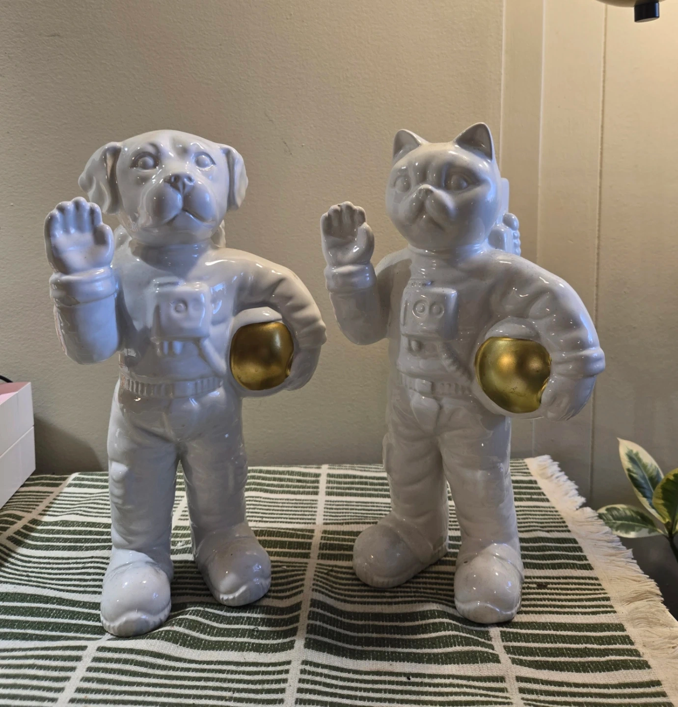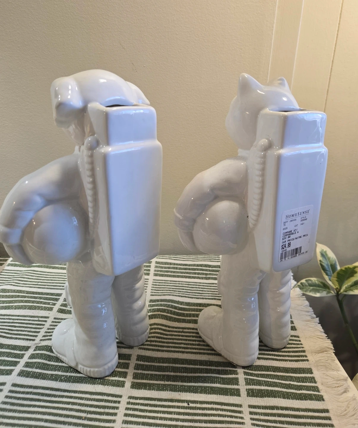 Cute white ceramic vases shaped like a dog and cat dressed as astronauts. These whimsical pieces are perfect for adding a touch of fun to your home decor. Use them to display small plants or as decorative accents.