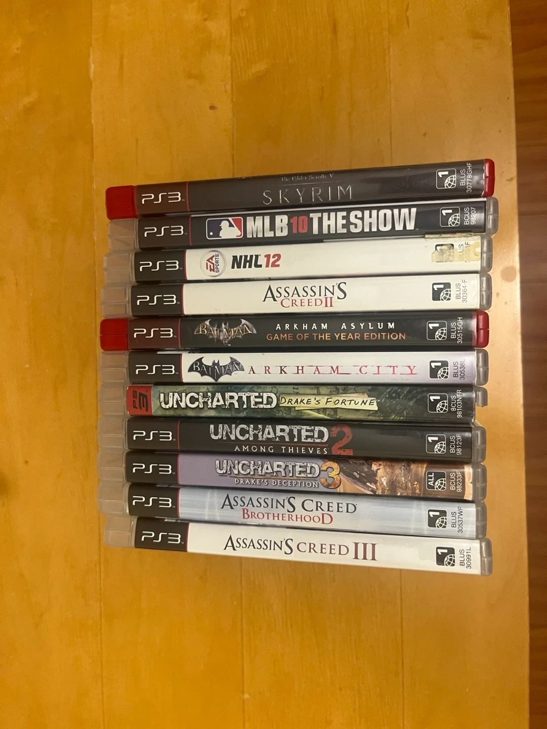 Bundle of 8 PS3 video games including Skyrim, MLB 10 The Show, NHL 12, Assassin's Creed II, Batman: Arkham Asylum, Uncharted: Drake's Fortune, Uncharted 2, and Assassin's Creed Brotherhood. Also includes Assassin's Creed III. All games are for PlayStation 3.