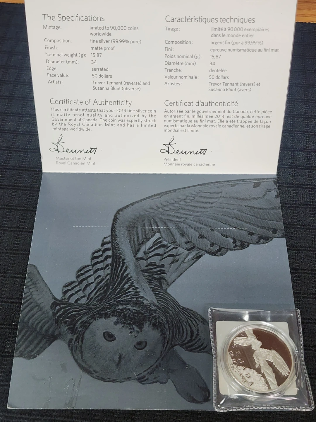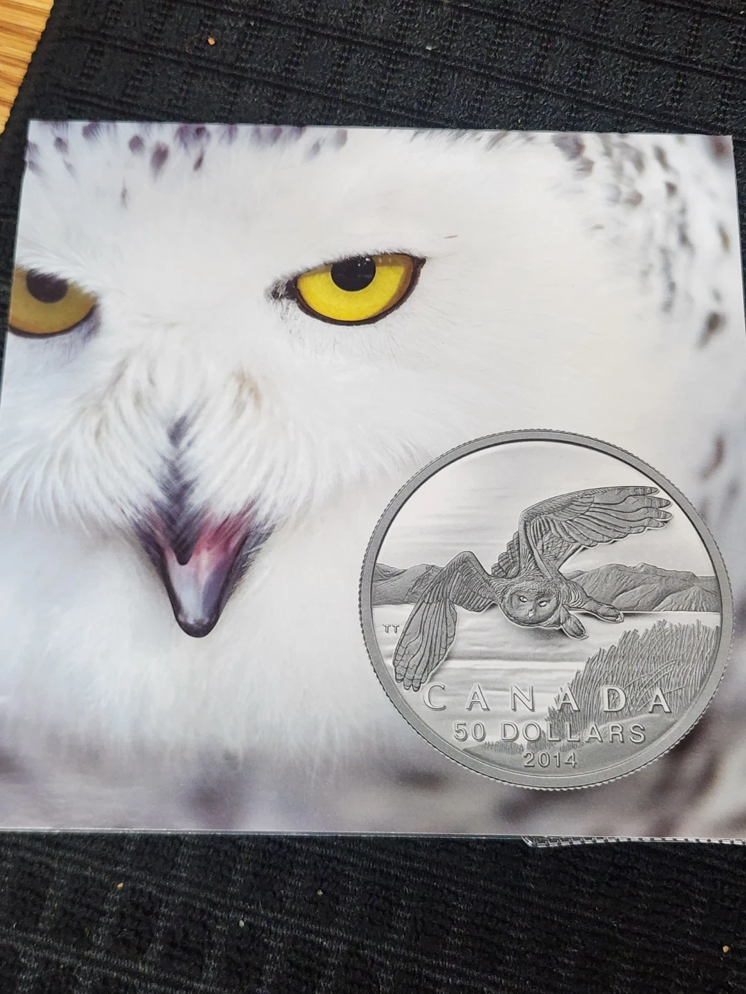 Selling a 2014 Canada $50 fine silver coin featuring a snowy owl.