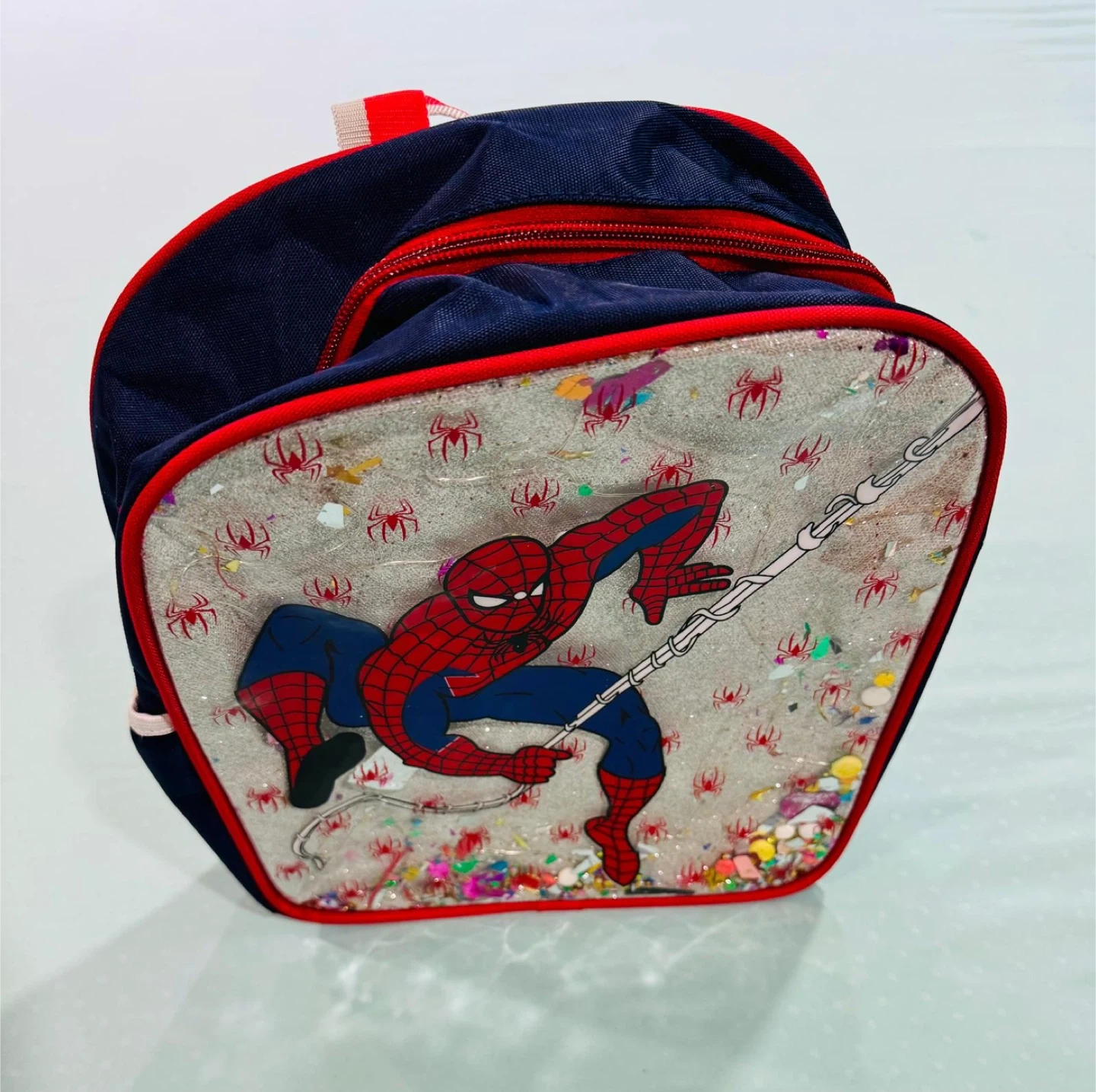 Kids' backpack featuring Spider-Man. It has adjustable straps and a zippered main compartment. The front panel has a clear window filled with glitter and tiny spider graphics.