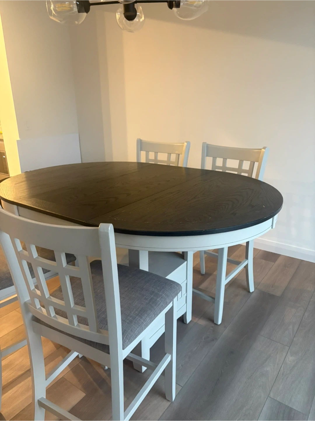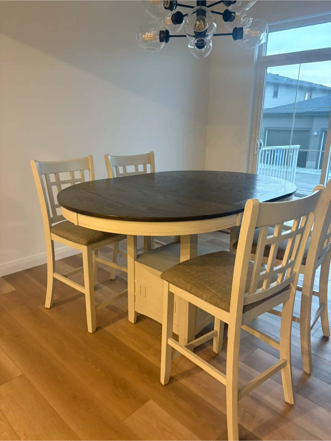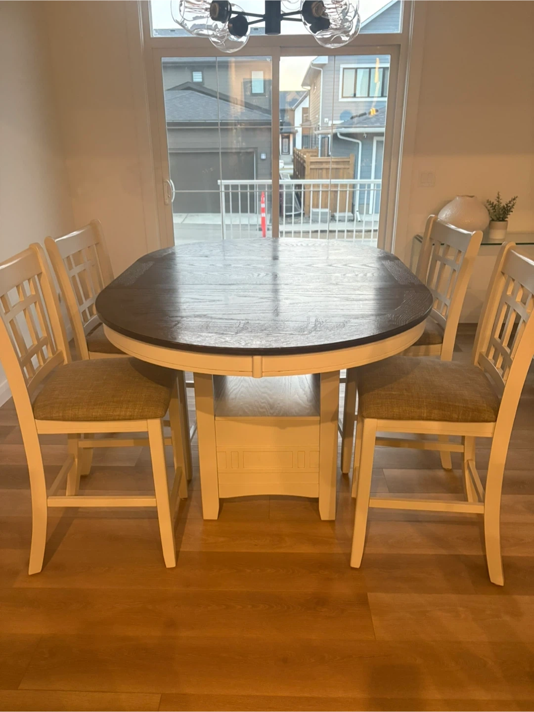 Selling a a high dining table only- (counter height), NO chairs. The table has a dark wood top and a greige base with a built-in shelf. The table shows signs of wear and tear but can still have years of use.