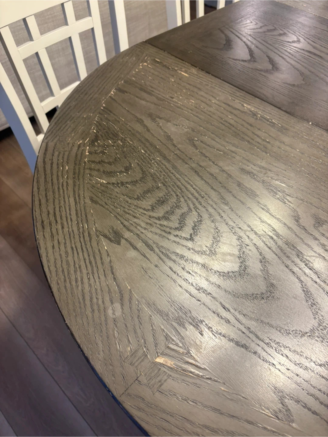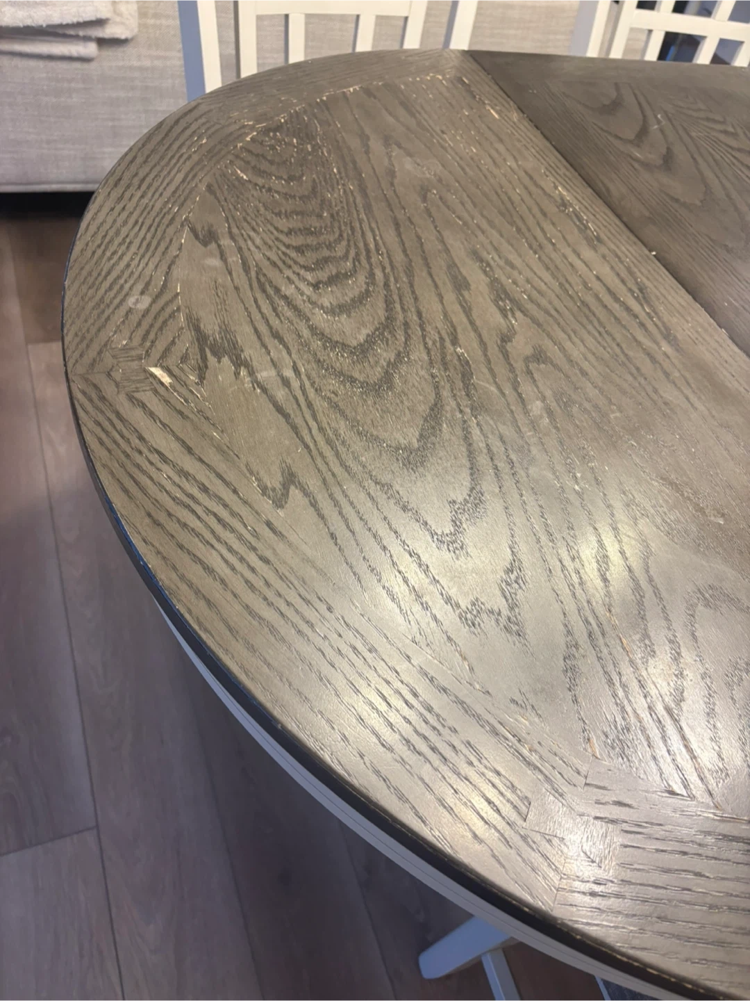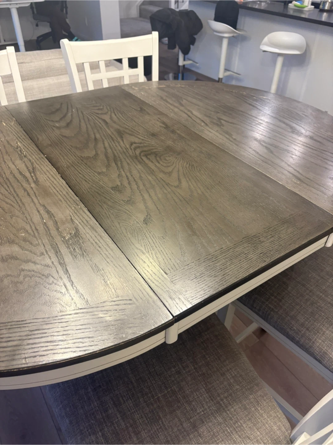 Selling a a high dining table only- (counter height), NO chairs. The table has a dark wood top and a greige base with a built-in shelf. The table shows signs of wear and tear but can still have years of use.