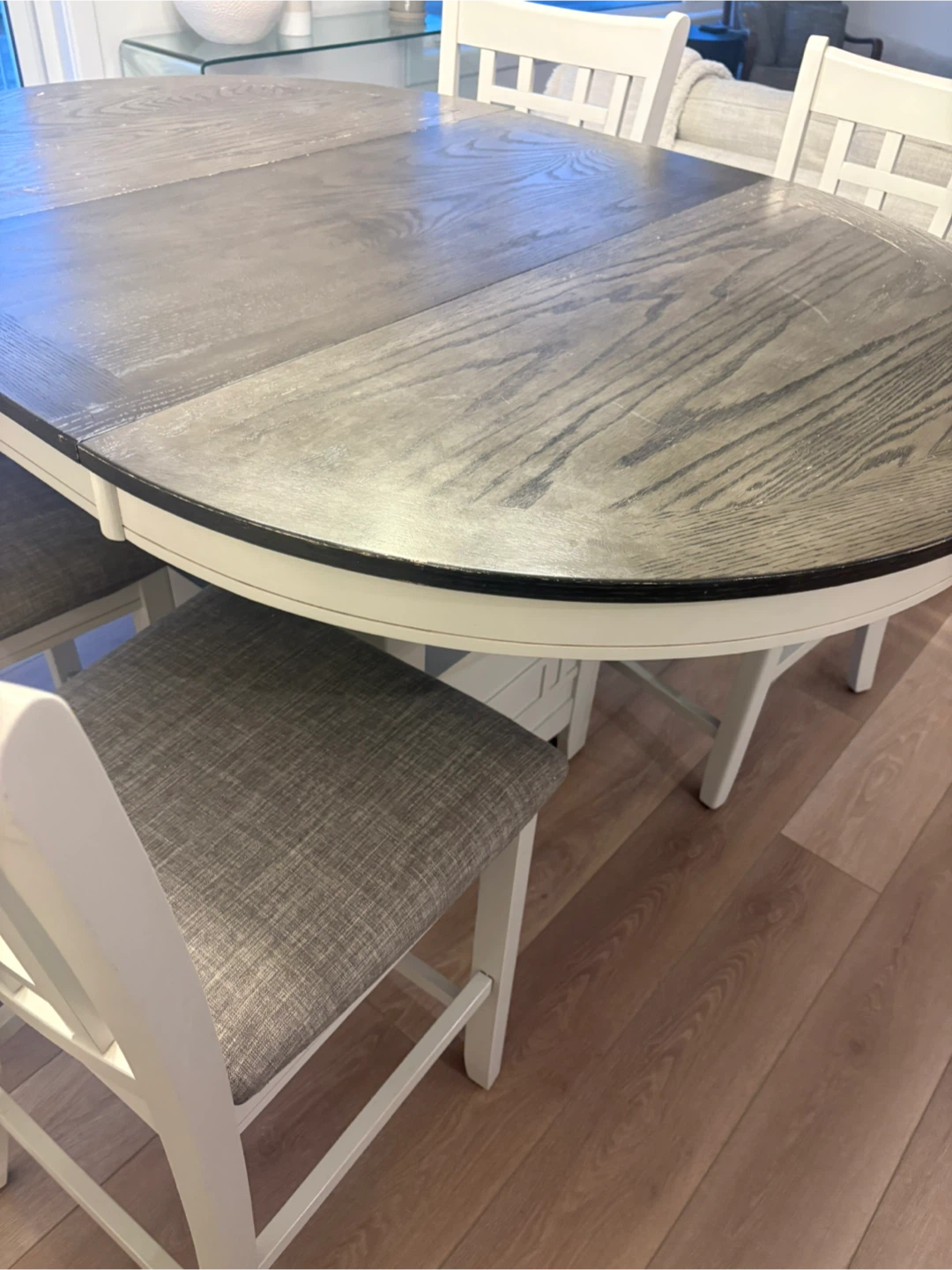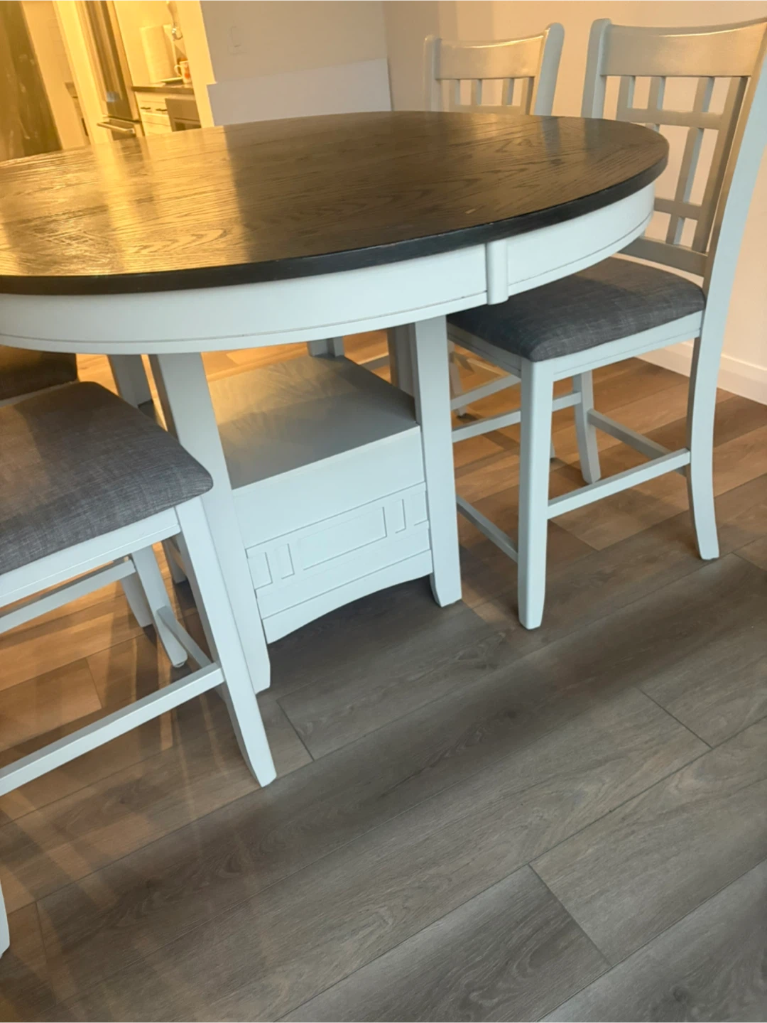 Selling a a high dining table only- (counter height), NO chairs. The table has a dark wood top and a greige base with a built-in shelf. The table shows signs of wear and tear but can still have years of use.