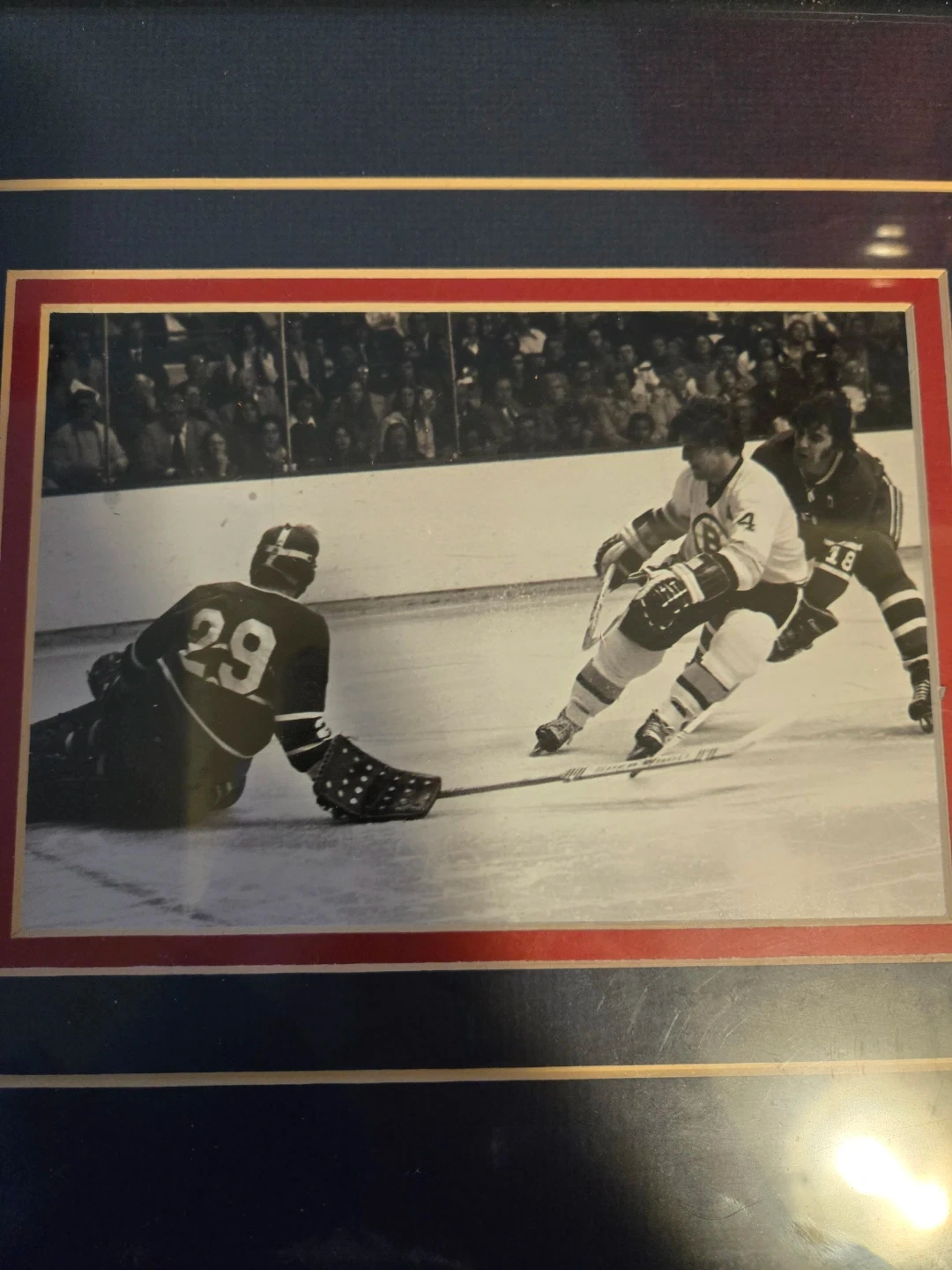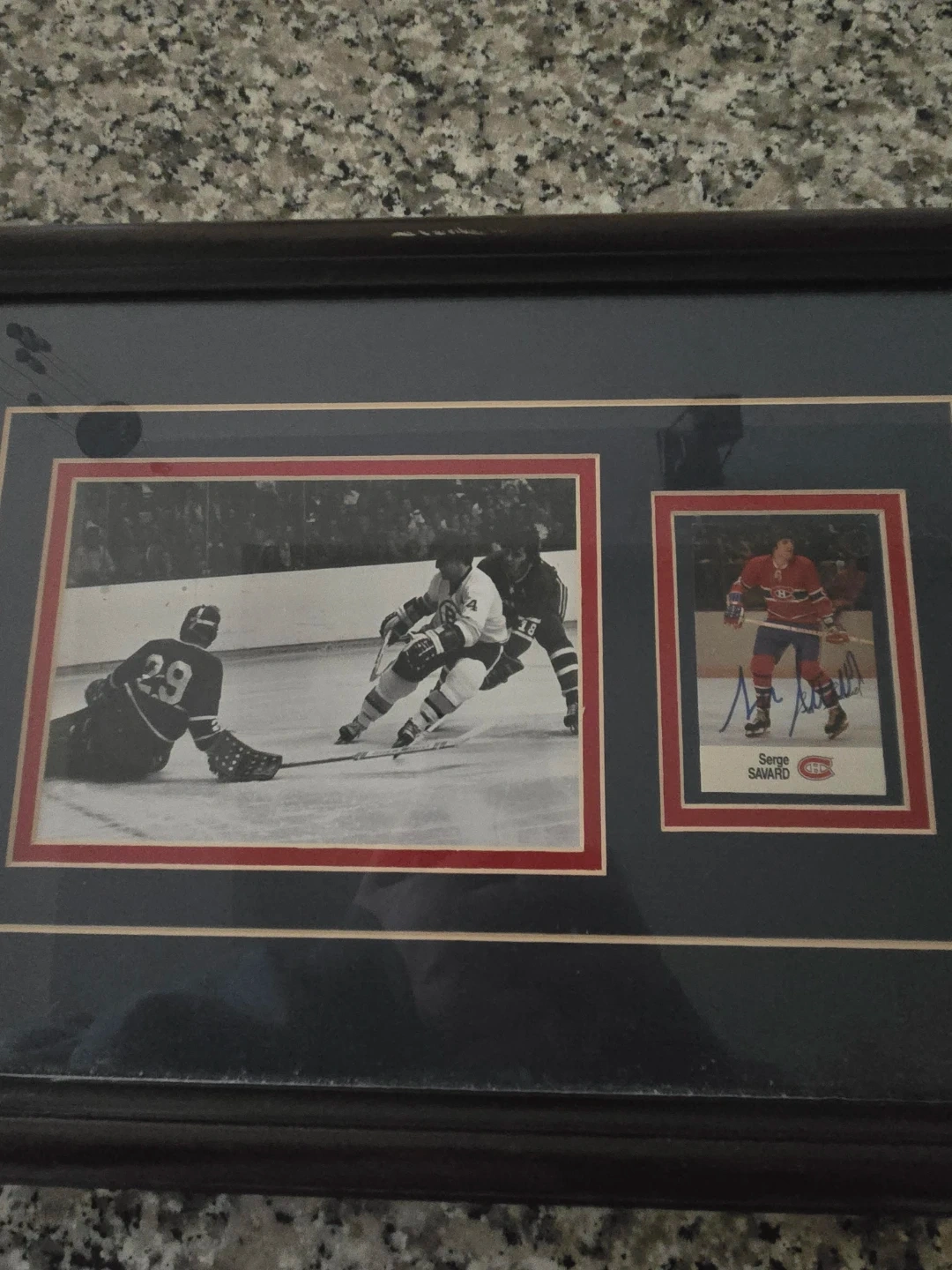 This framed photo captures a Montreal Canadiens hockey game. It features an autographed image of Serge Savard. Great for any hockey enthusiast's collection! The autograph is authentic.