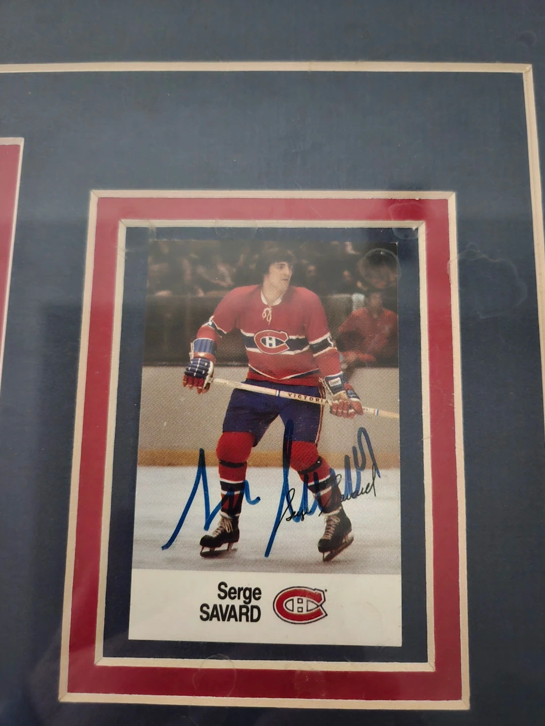 This framed photo captures a Montreal Canadiens hockey game. It features an autographed image of Serge Savard. Great for any hockey enthusiast's collection! The autograph is authentic.
