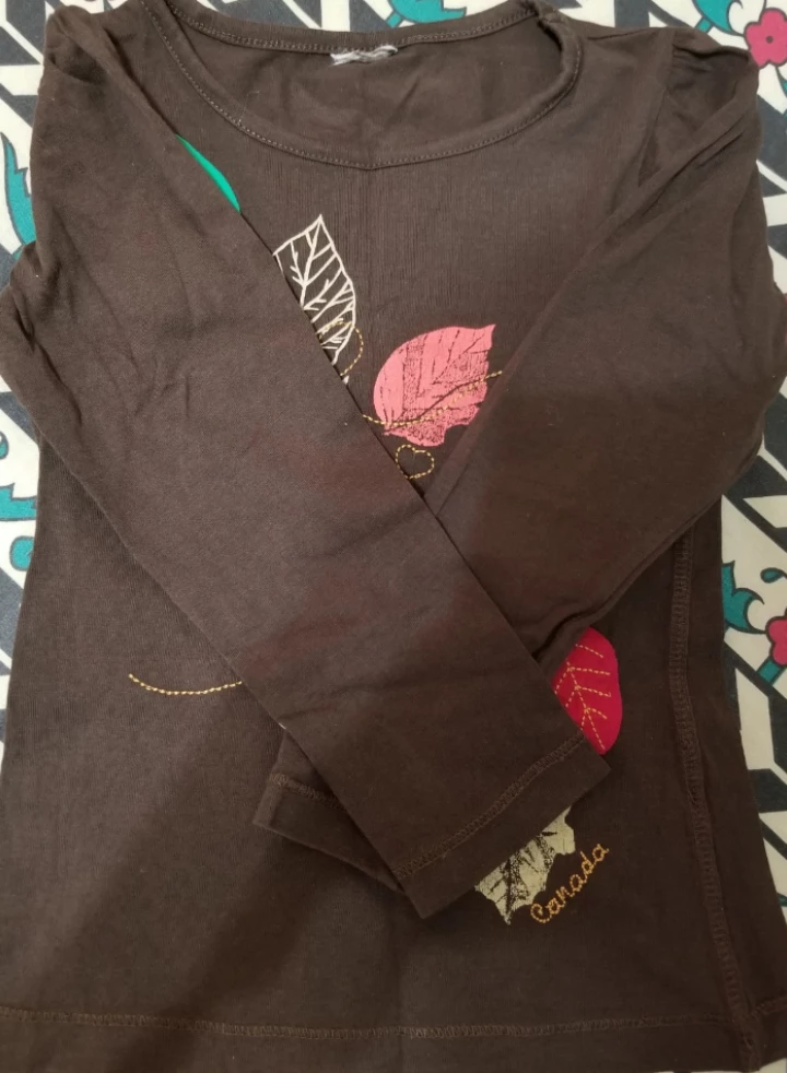 This brown long-sleeved shirt features a colourful leaf design with embroidered details. It's made of soft fabric for comfort. A cute addition to any child's wardrobe!