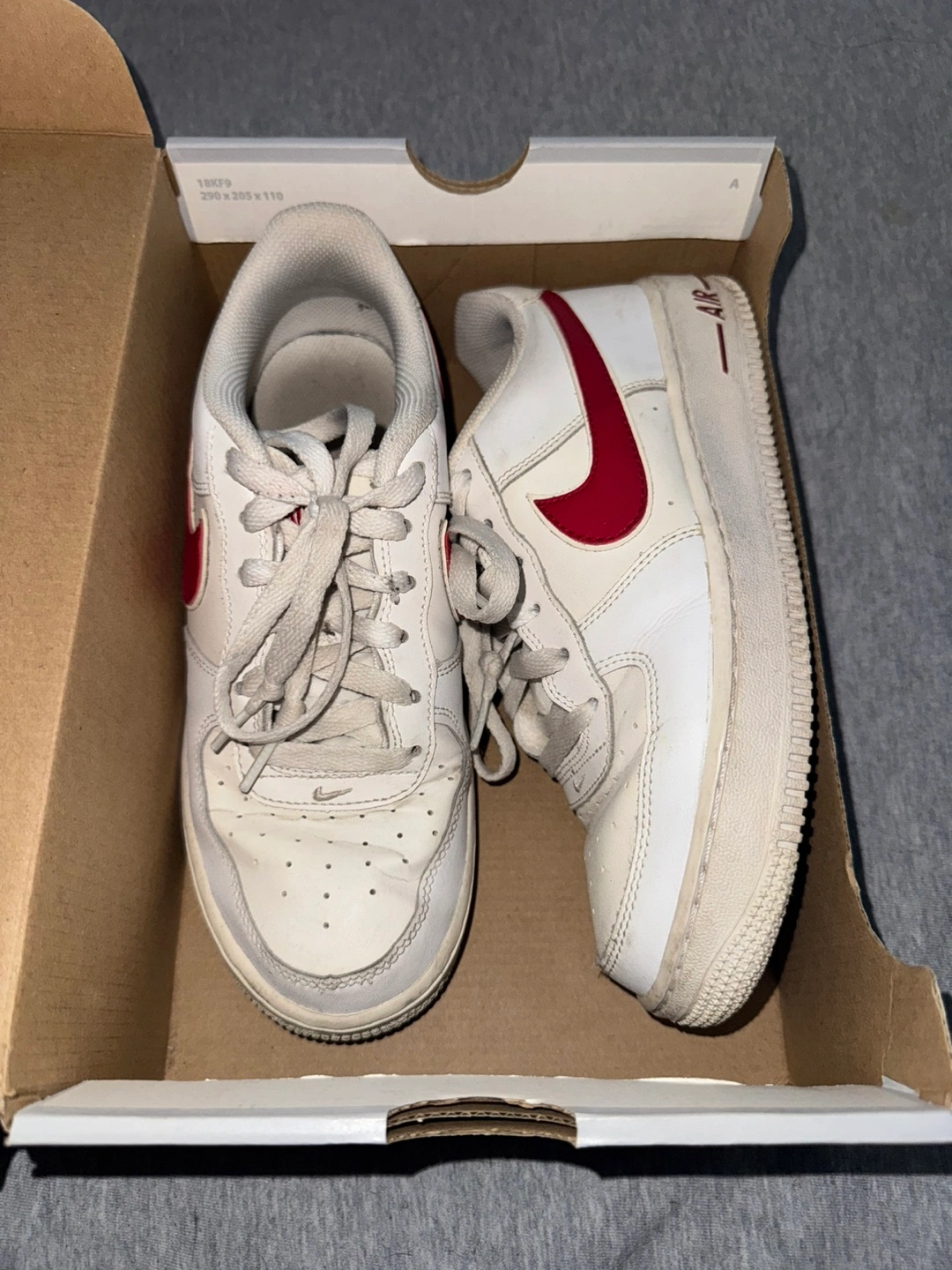 Selling a pair of Nike Air Force 1s in white with red accents. 6.5 youth but fits like a women’s size 7 They're in used condition, as you can see in the photos, but still have lots of life left! Comes with the original box