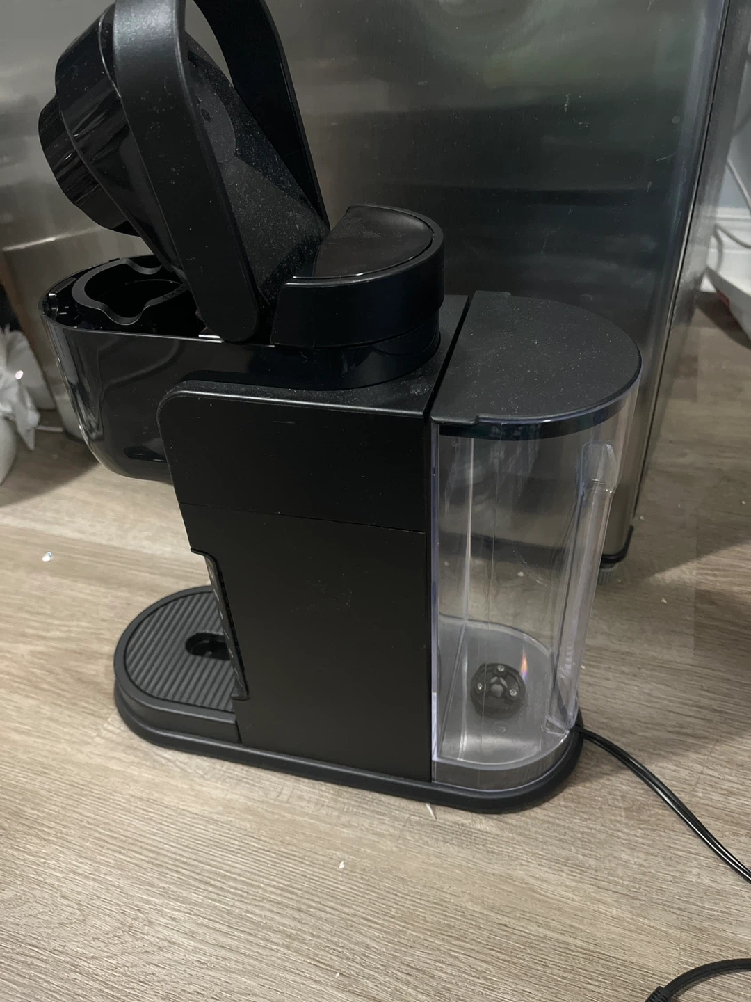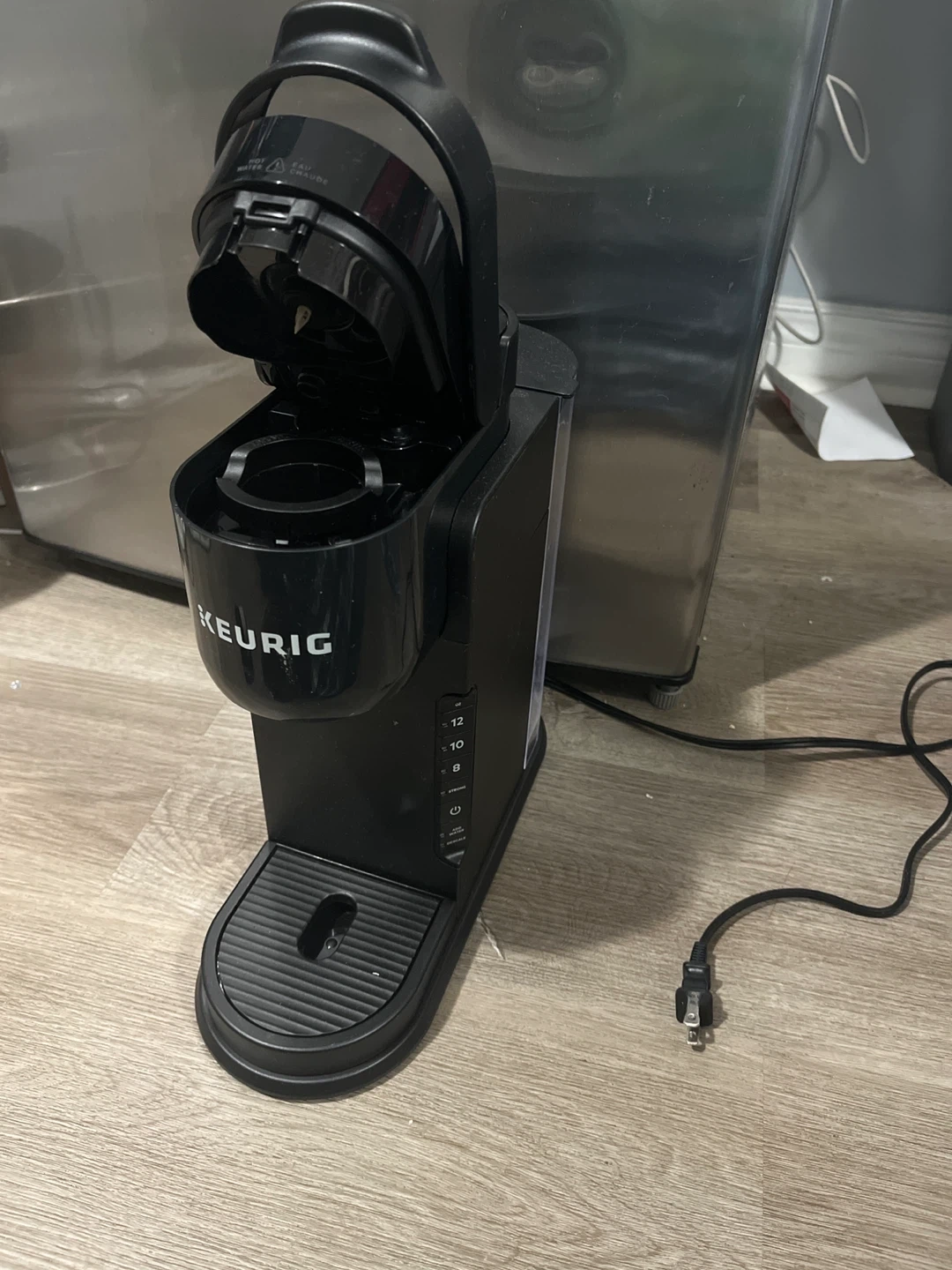 This Keurig K-Express coffee maker is black and has a removable water reservoir. It's designed for single-serve K-Cup pods. Buttons for brew sizes 8, 10, and 12 ounces are visible.