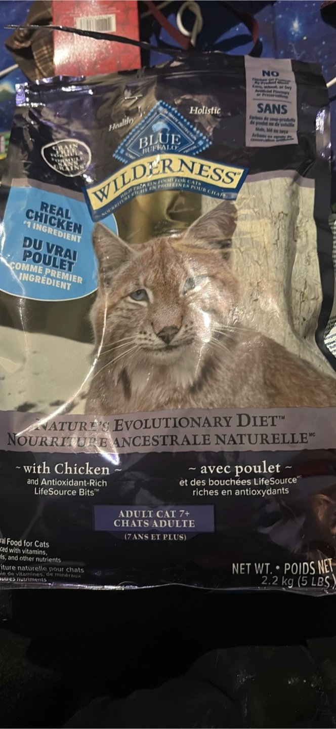 Blue Buffalo Wilderness cat food with real chicken as the first ingredient. It's a high-protein formula for adult cats 7+ years old. Contains Antioxidant-Rich LifeSource Bits.