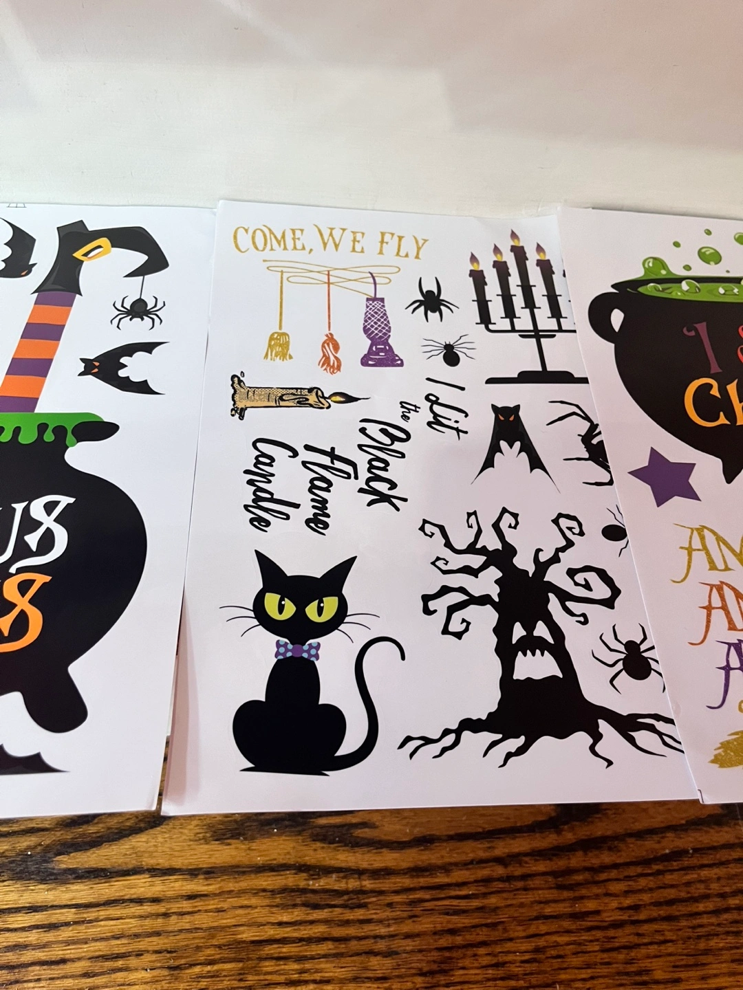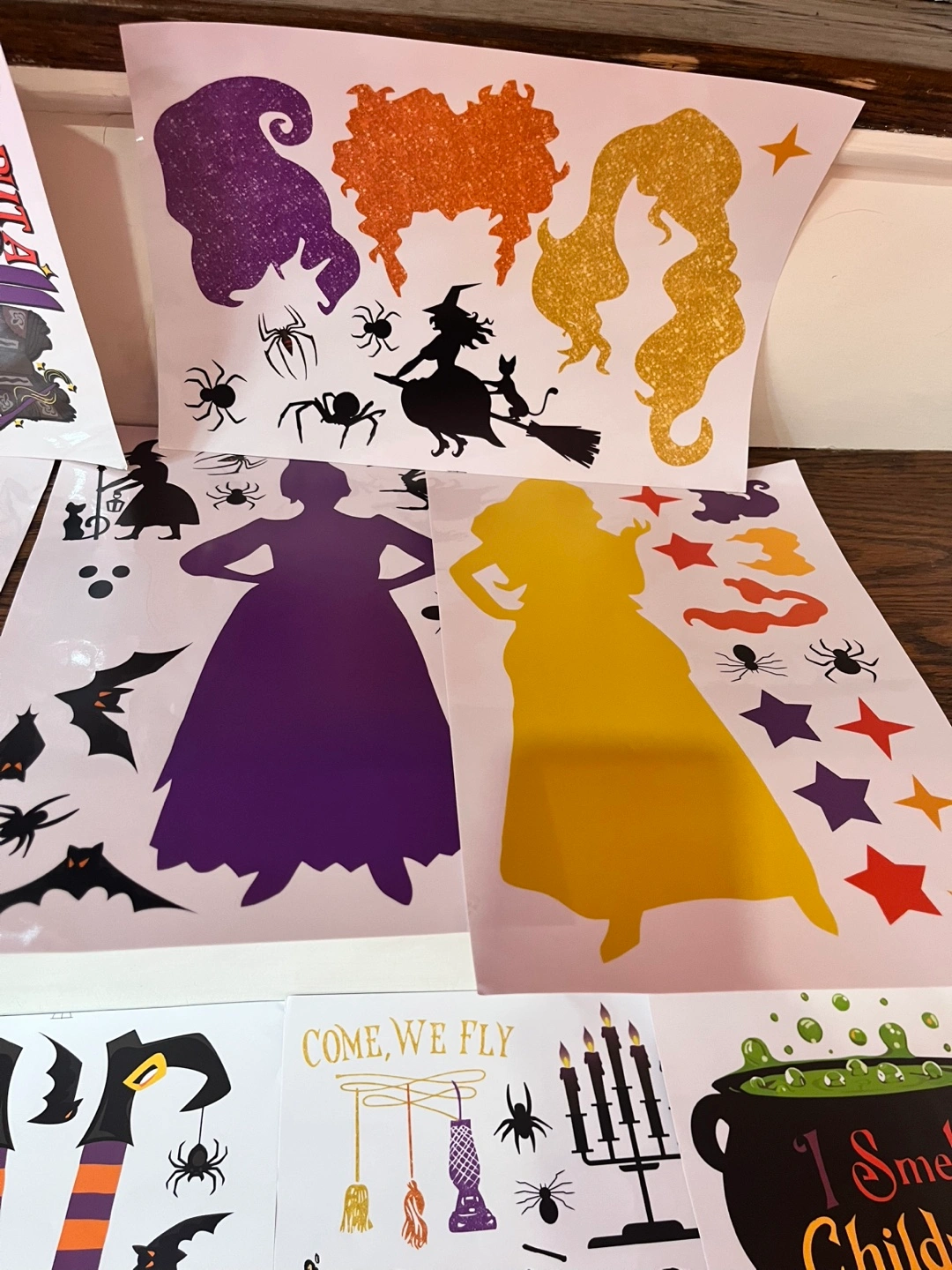 Set of Halloween-themed window stickers. Features witches, black cats, cauldrons, and other spooky imagery. Perfect for decorating for Halloween.