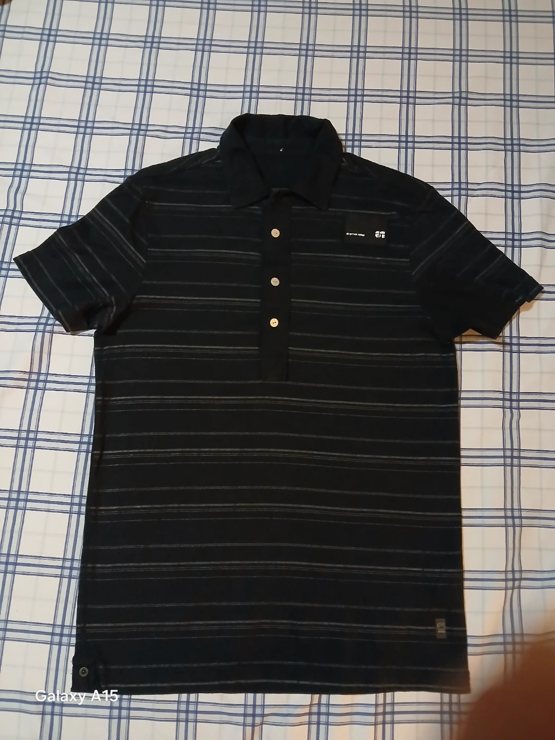 Here's a gently used G-Star Raw polo shirt. It features a stylish black and grey striped pattern and a classic polo design. Great for casual wear!