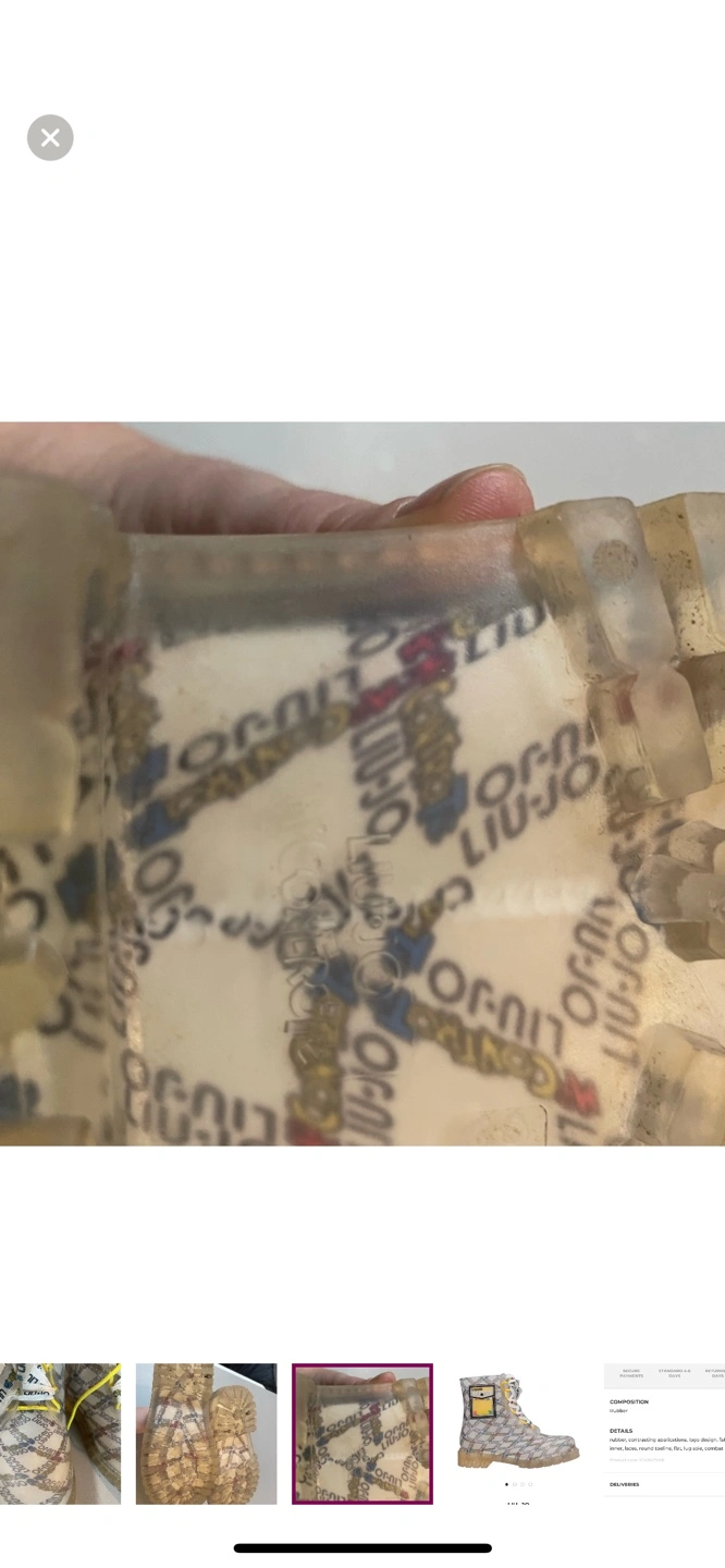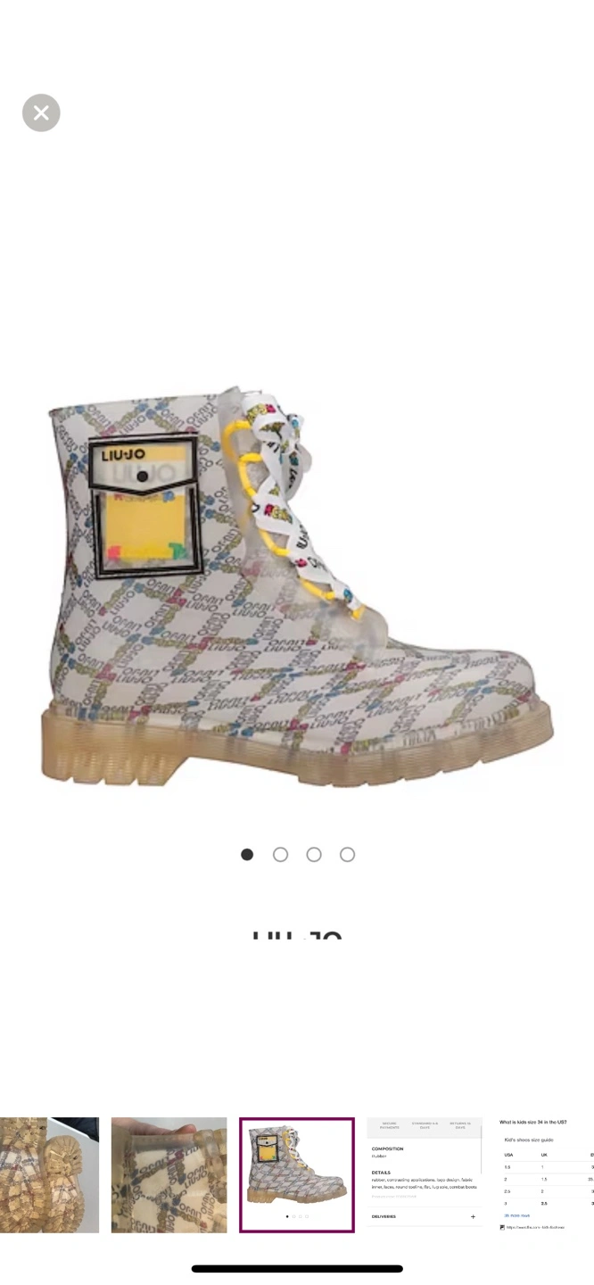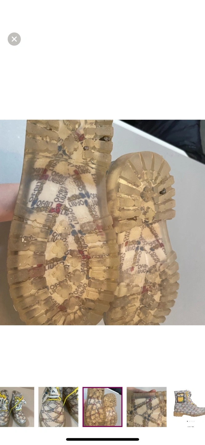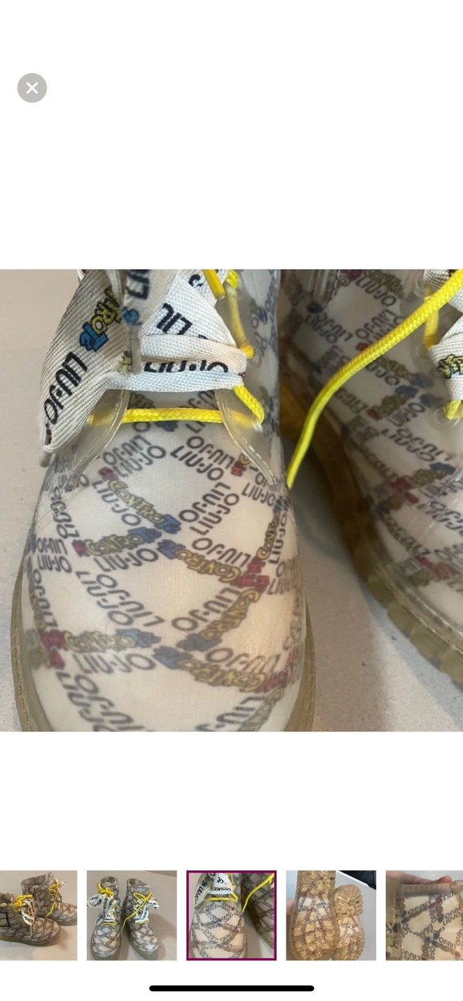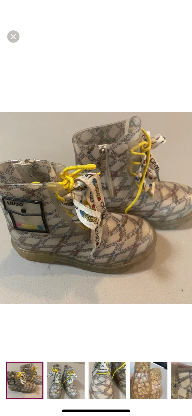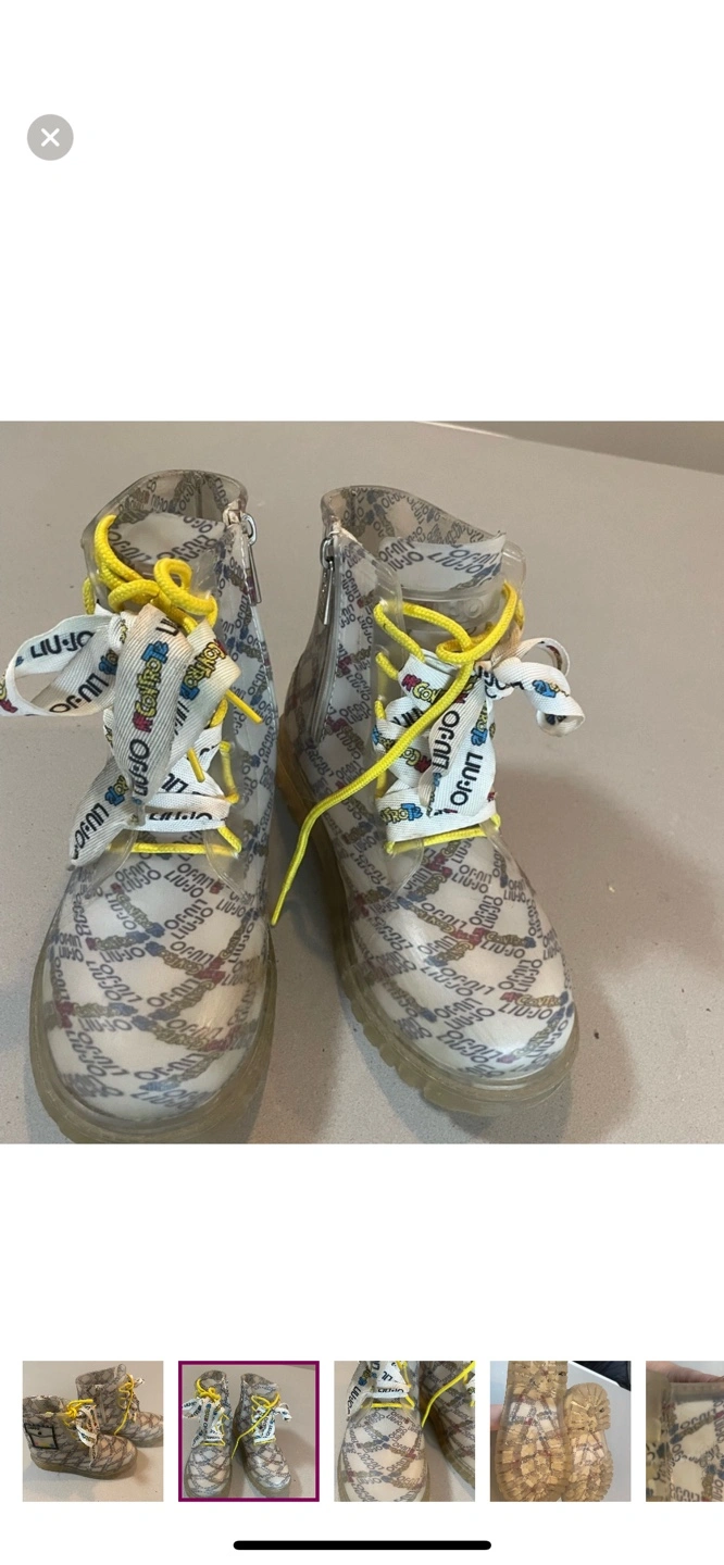 Liu Jo kids' rain boots. Size 2. Clear rubber with branded pattern. Yellow laces. Great for rainy days.