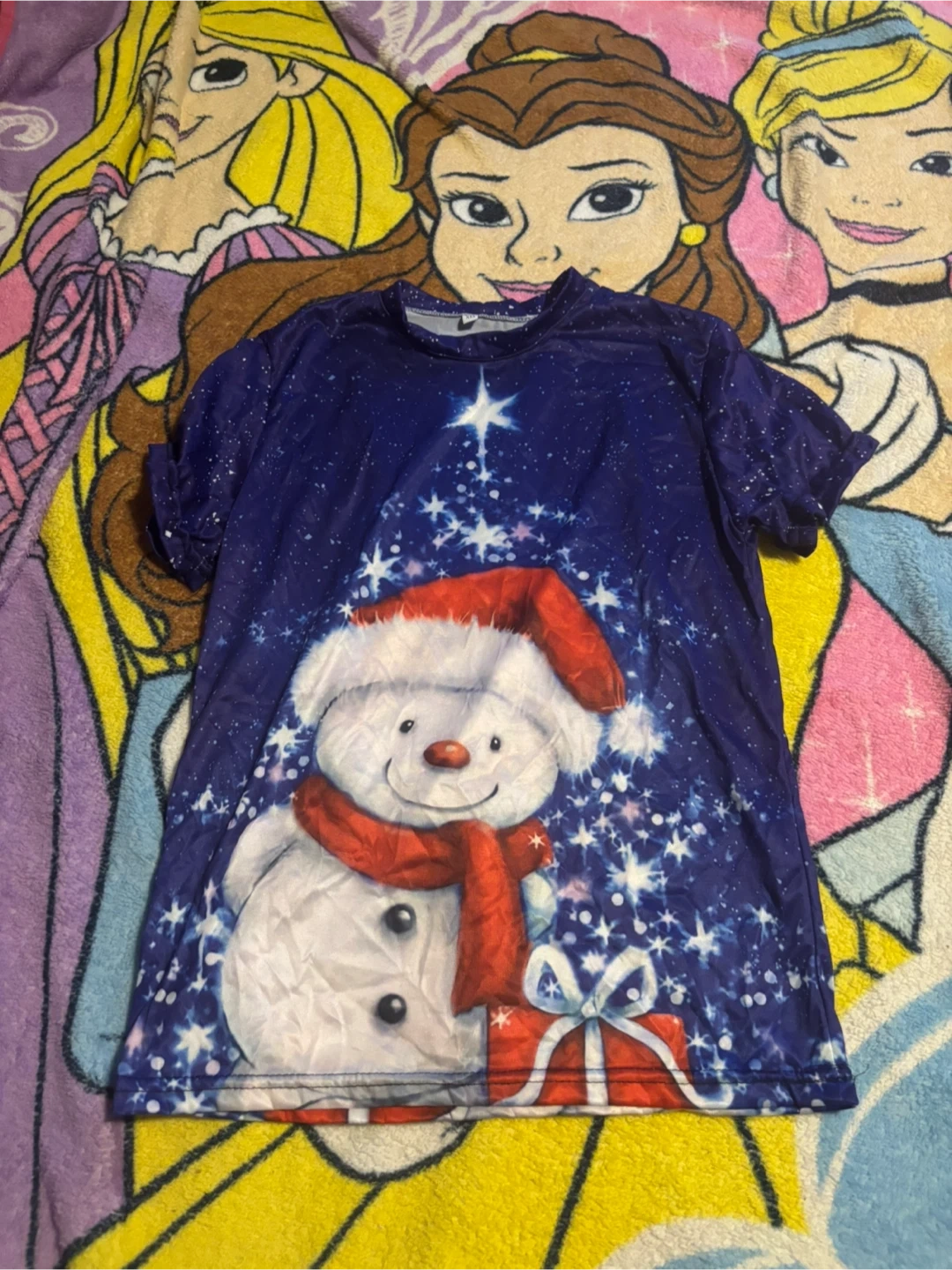 This t-shirt features a festive snowman design with a Santa hat and red scarf, surrounded by a starry night sky. It's perfect for holiday events or casual wear during the winter season. The shirt's graphic is vibrant and fun, sure to bring some cheer!