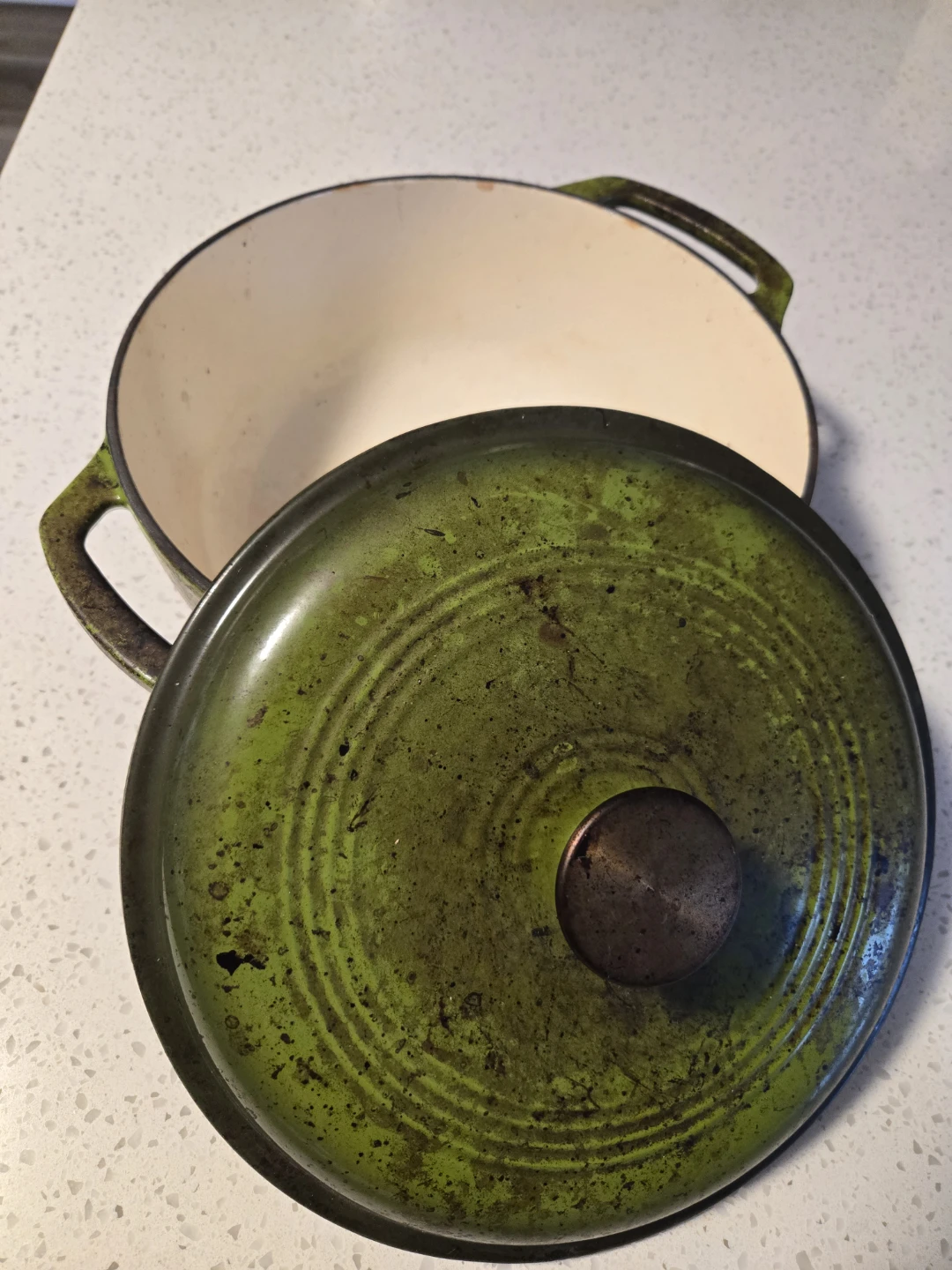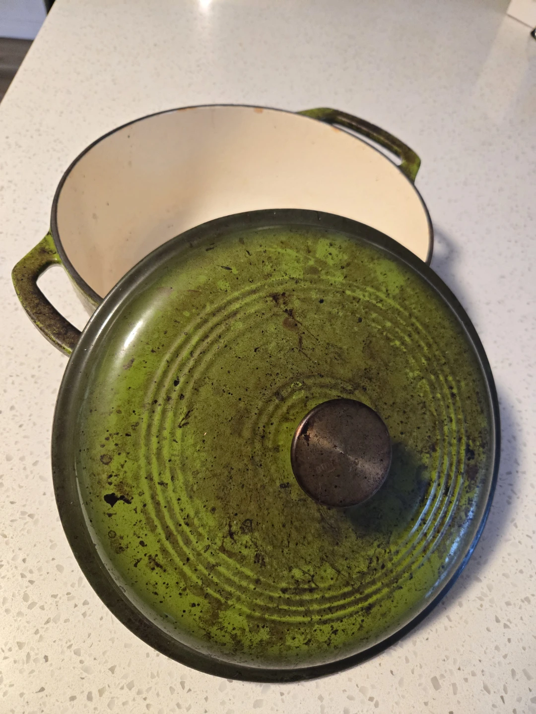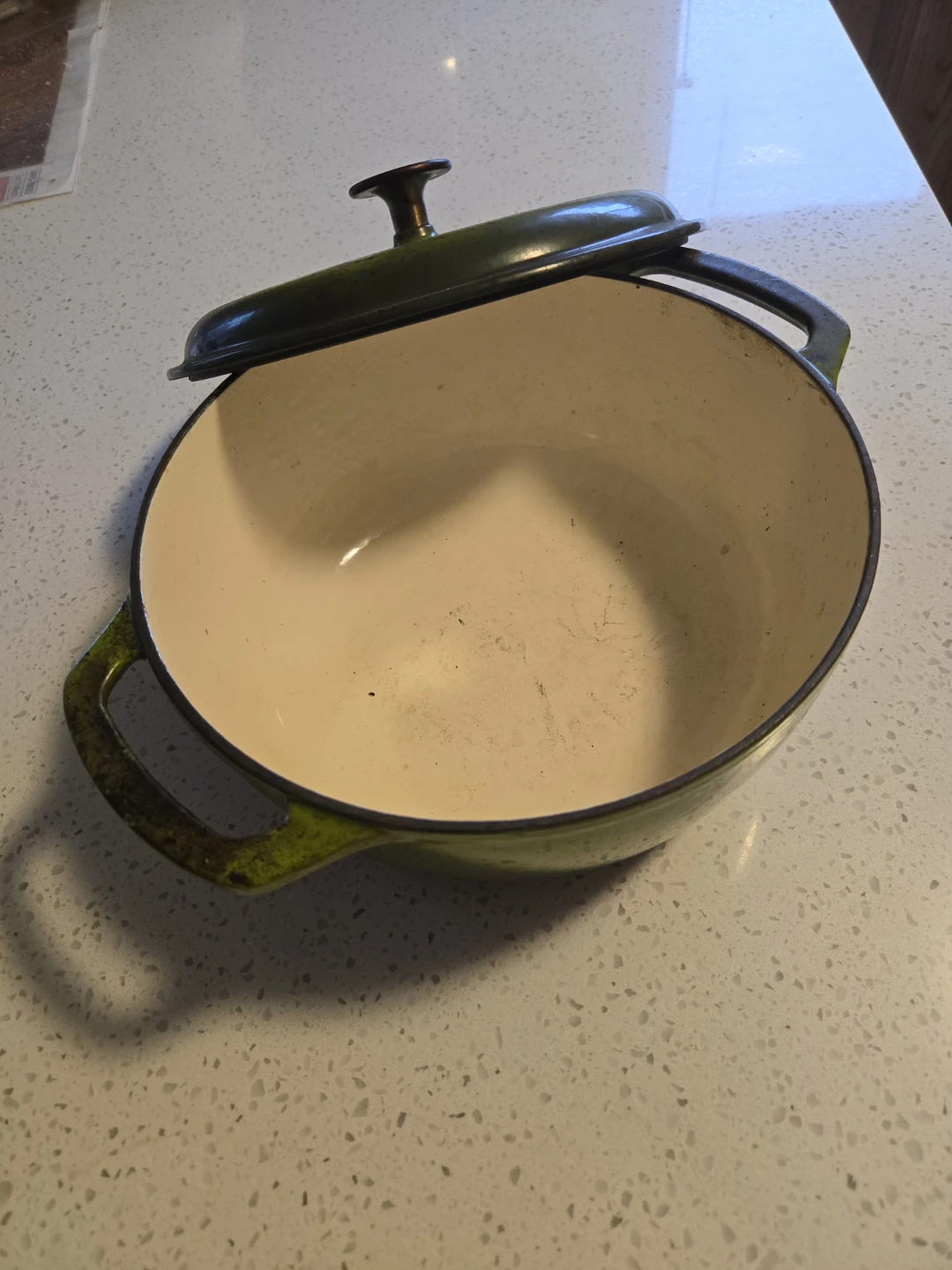 Selling a green enamel dutch oven. It has some signs of use, but is still in good condition for cooking up your favourite meals! Has been used solely for making bread.