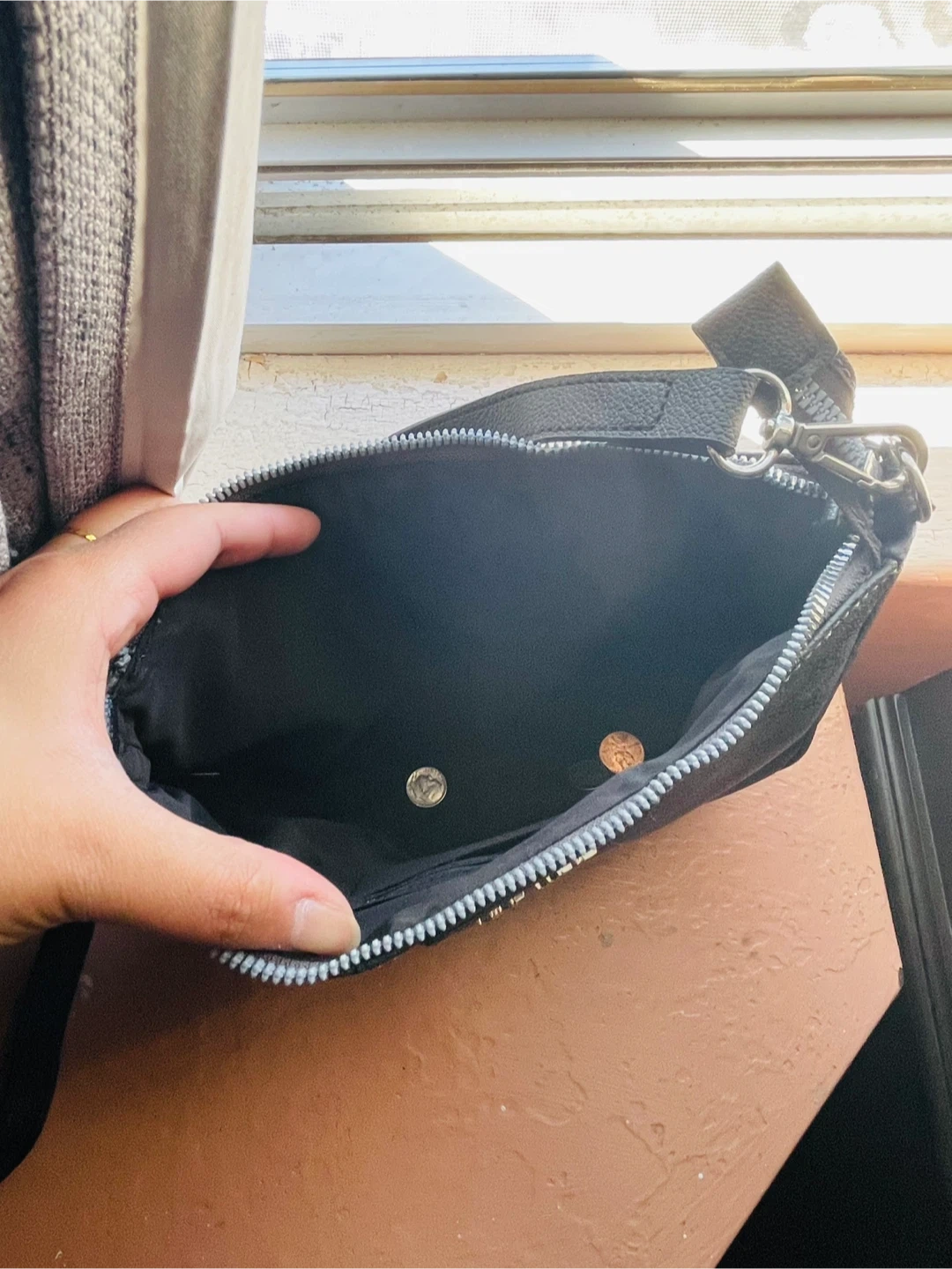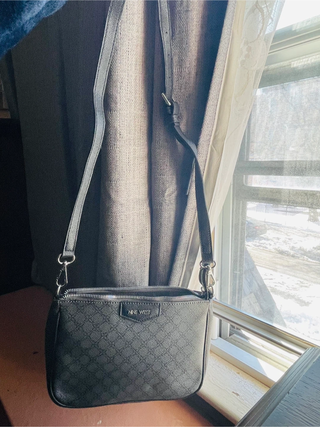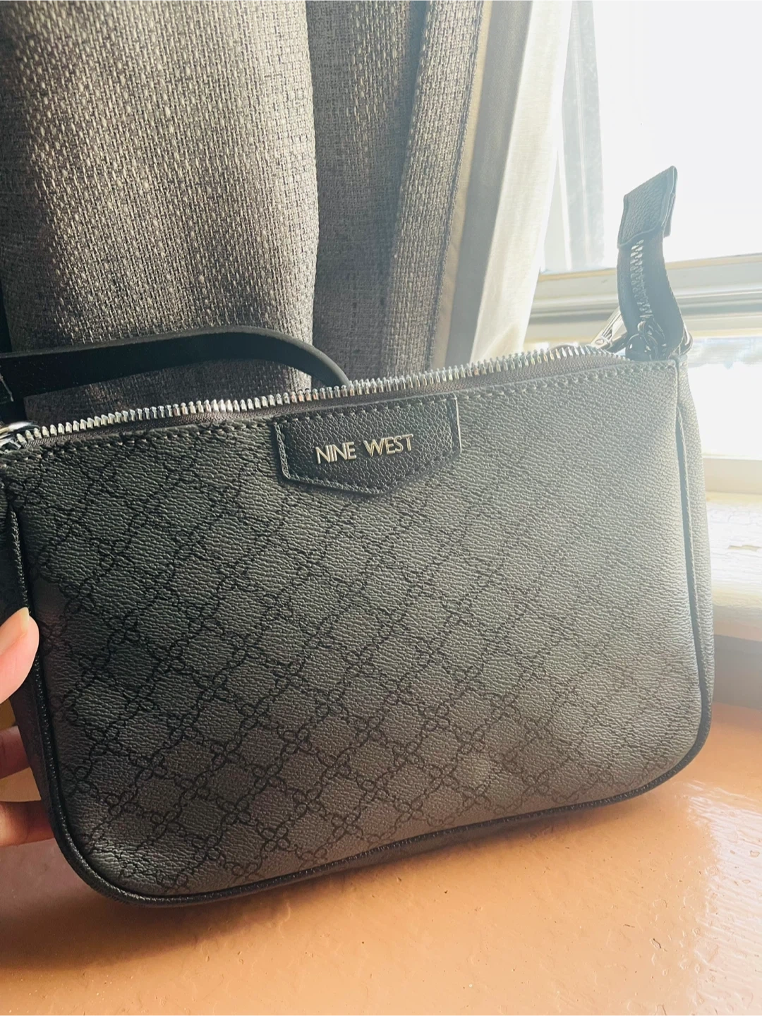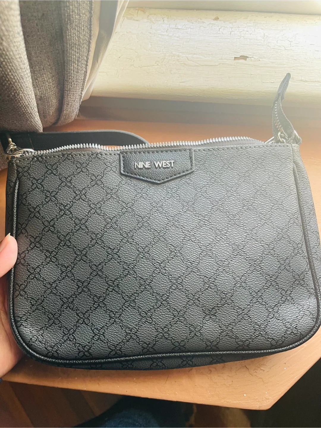 This Nine West crossbody bag is black with a repeating monogram pattern. It has a zippered closure and a single strap. The interior is black.