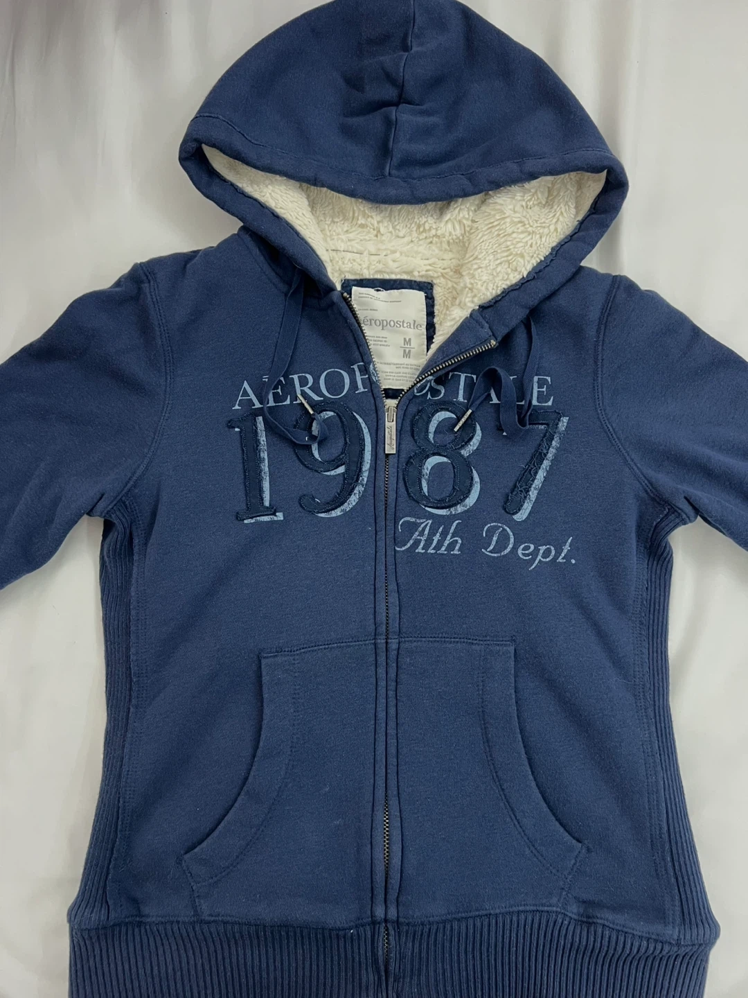 Cozy Aeropostale zip-up hoodie with a sherpa-lined hood and body. It features a bold '1987 Ath Dept.' graphic on the front. This hoodie is size medium and perfect for staying warm.