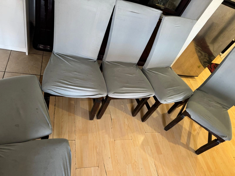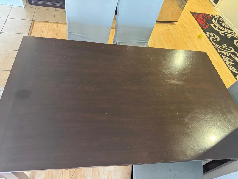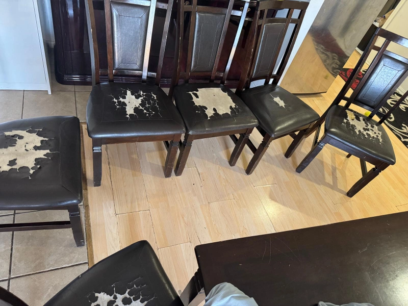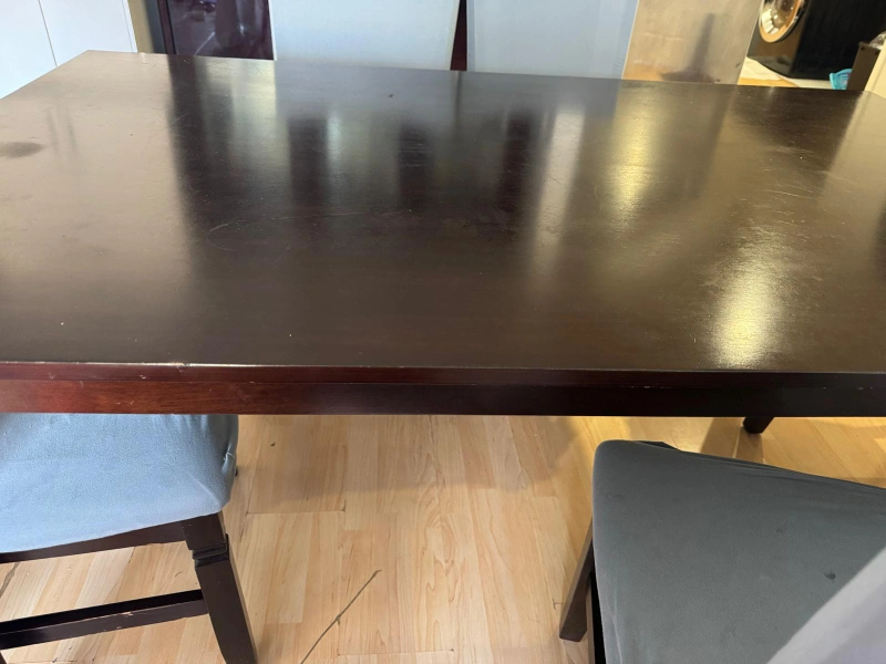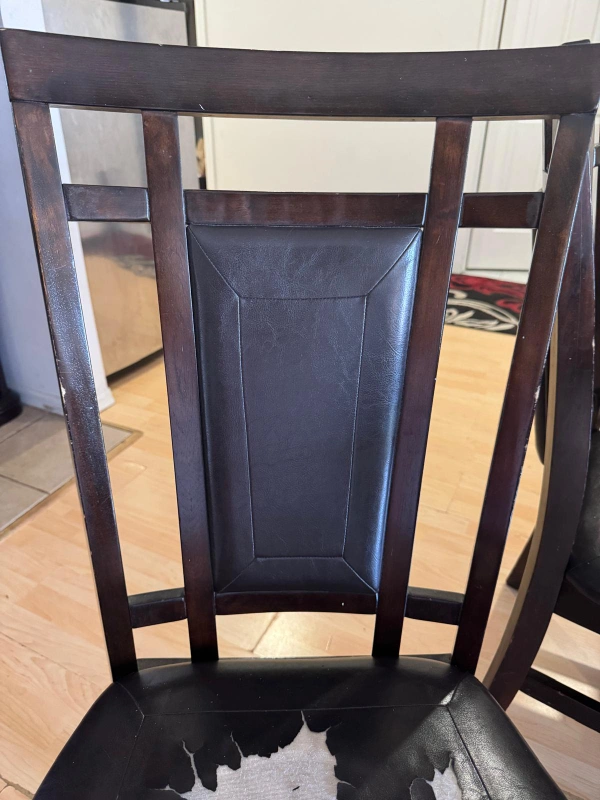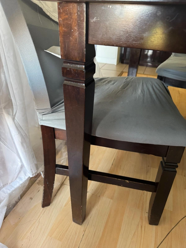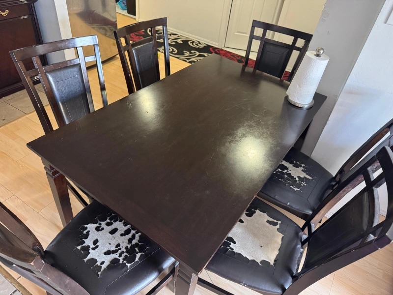 Selling a dining table set that includes 6 chairs. The table is a dark wood colour. The chairs are also dark wood with leather seats that show some wear and tear. Great for a family looking for a dining set!