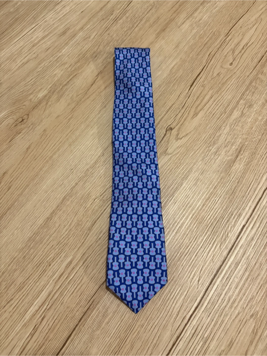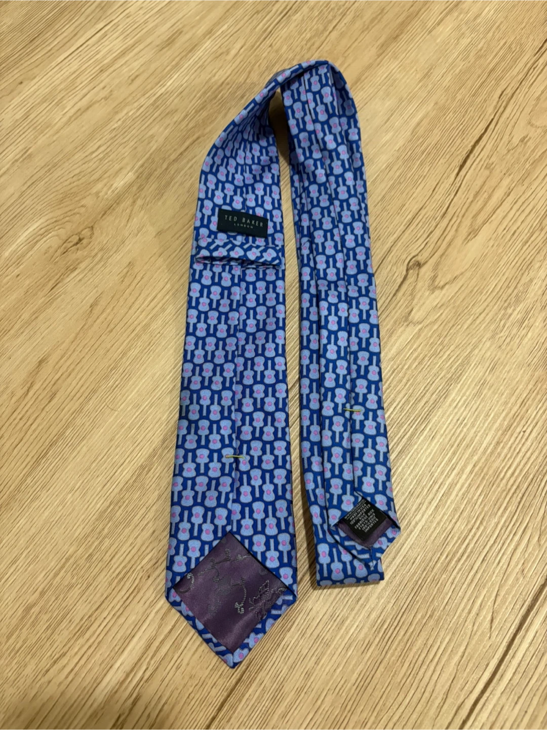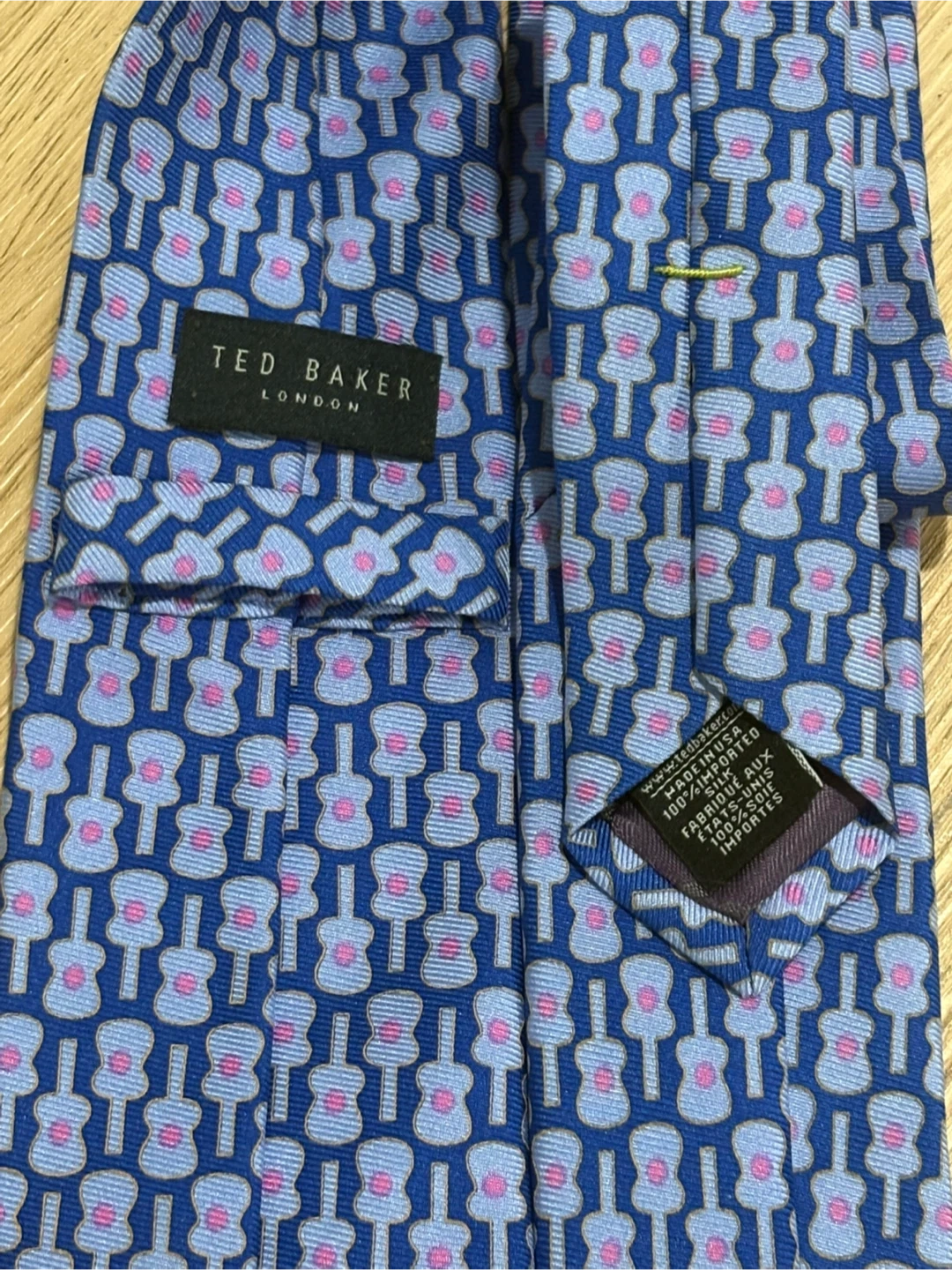 Ted Baker London silk tie. Features a fun blue and purple guitar pattern. made in USA, 100% silk.