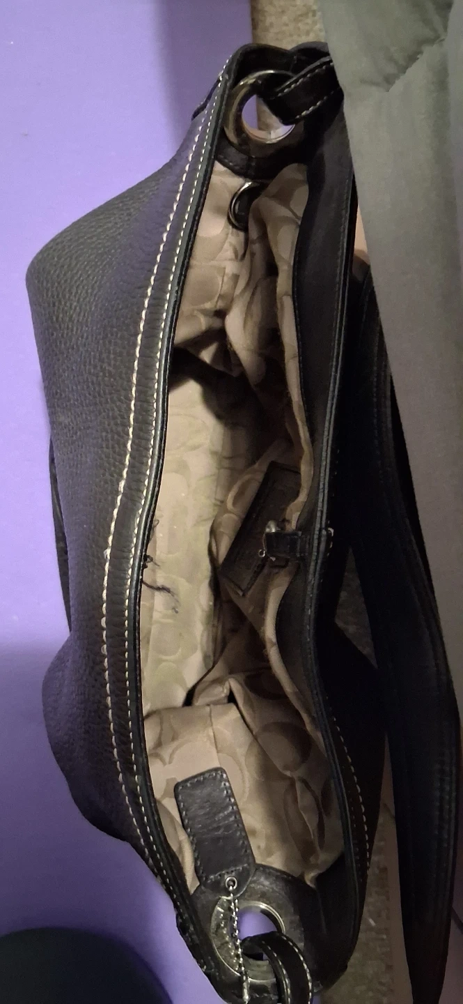 A classic black leather hobo purse from Coach. It features a pebbled leather exterior with contrast stitching. The interior lining has the Coach logo pattern. This bag is great for everyday use!