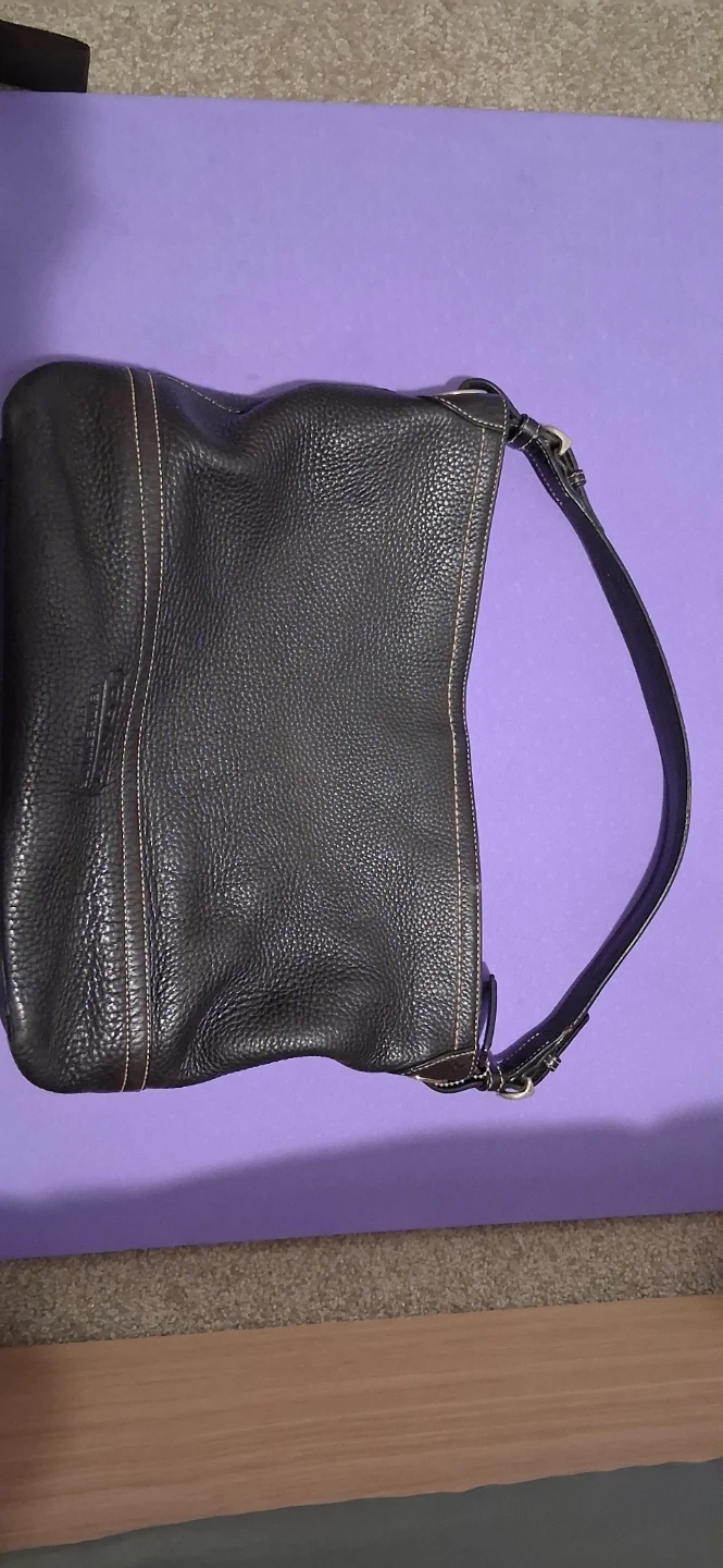 A classic black leather hobo purse from Coach. It features a pebbled leather exterior with contrast stitching. The interior lining has the Coach logo pattern. This bag is great for everyday use!