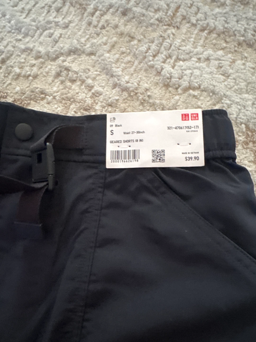 Uniqlo black geared shorts. Waist 27-30inch. Includes adjustable belt. Made in Vietnam. These shorts are great for casual wear or outdoor activities!