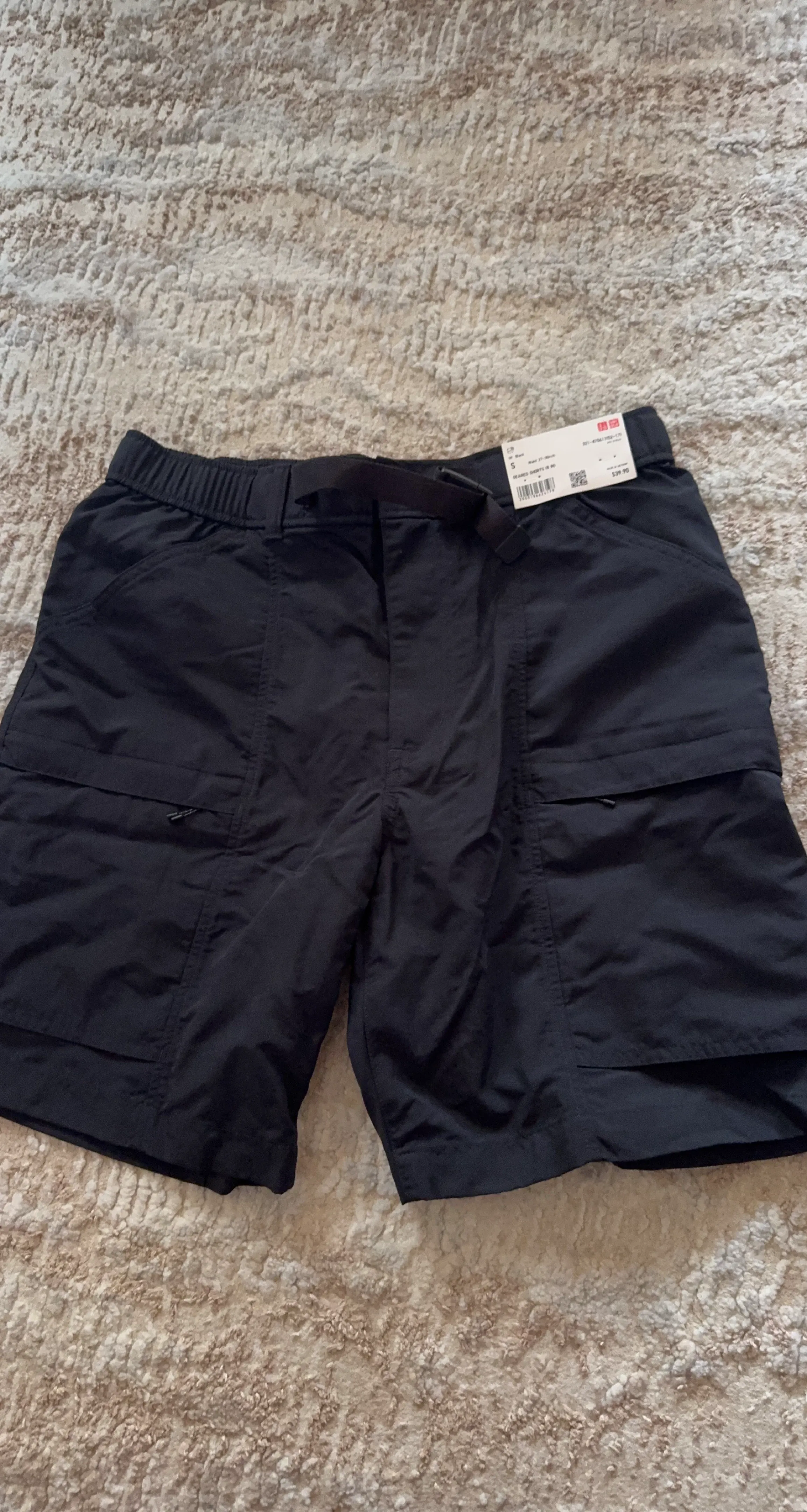 Uniqlo black geared shorts. Waist 27-30inch. Includes adjustable belt. Made in Vietnam. These shorts are great for casual wear or outdoor activities!